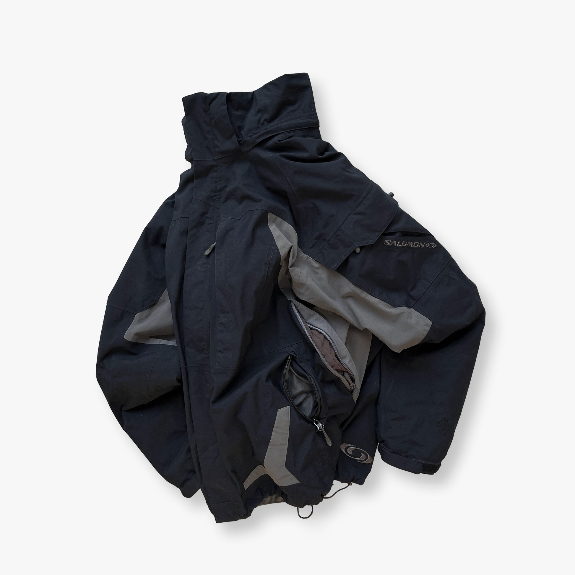 Black/Grey 2008 2in1 Salomon Vent Ski Jacket. The Black weatherproof ClimaPro outer is seam-taped & attaches to a grey Primaloft inner layer for extra warmth.
