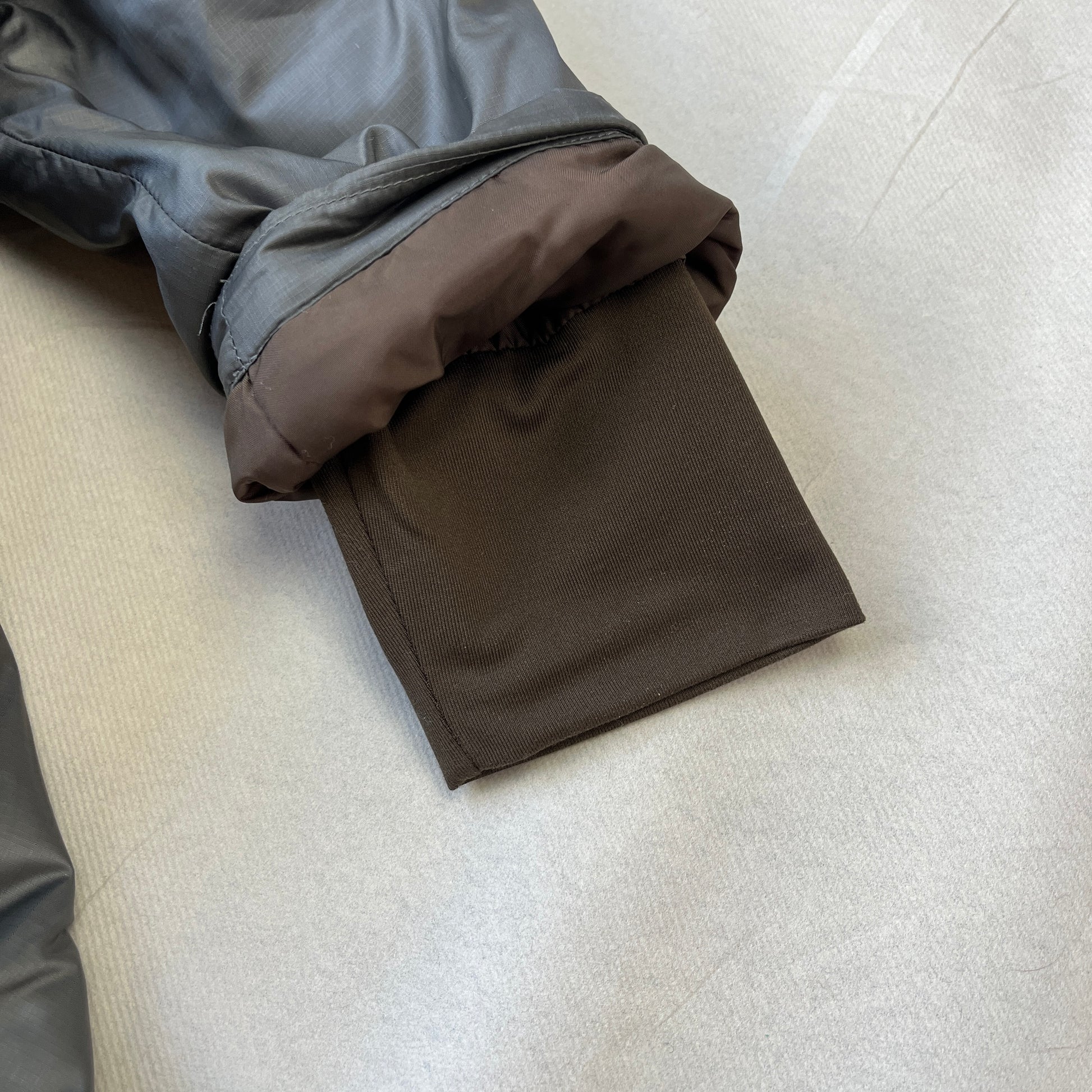 The secondary inner layer is a Primaloft insulated nylon jacket, has open pockets, 1 inside zip-pocket & buttons to attach it to the outer jacket. It also has a double cuff for windproofness.