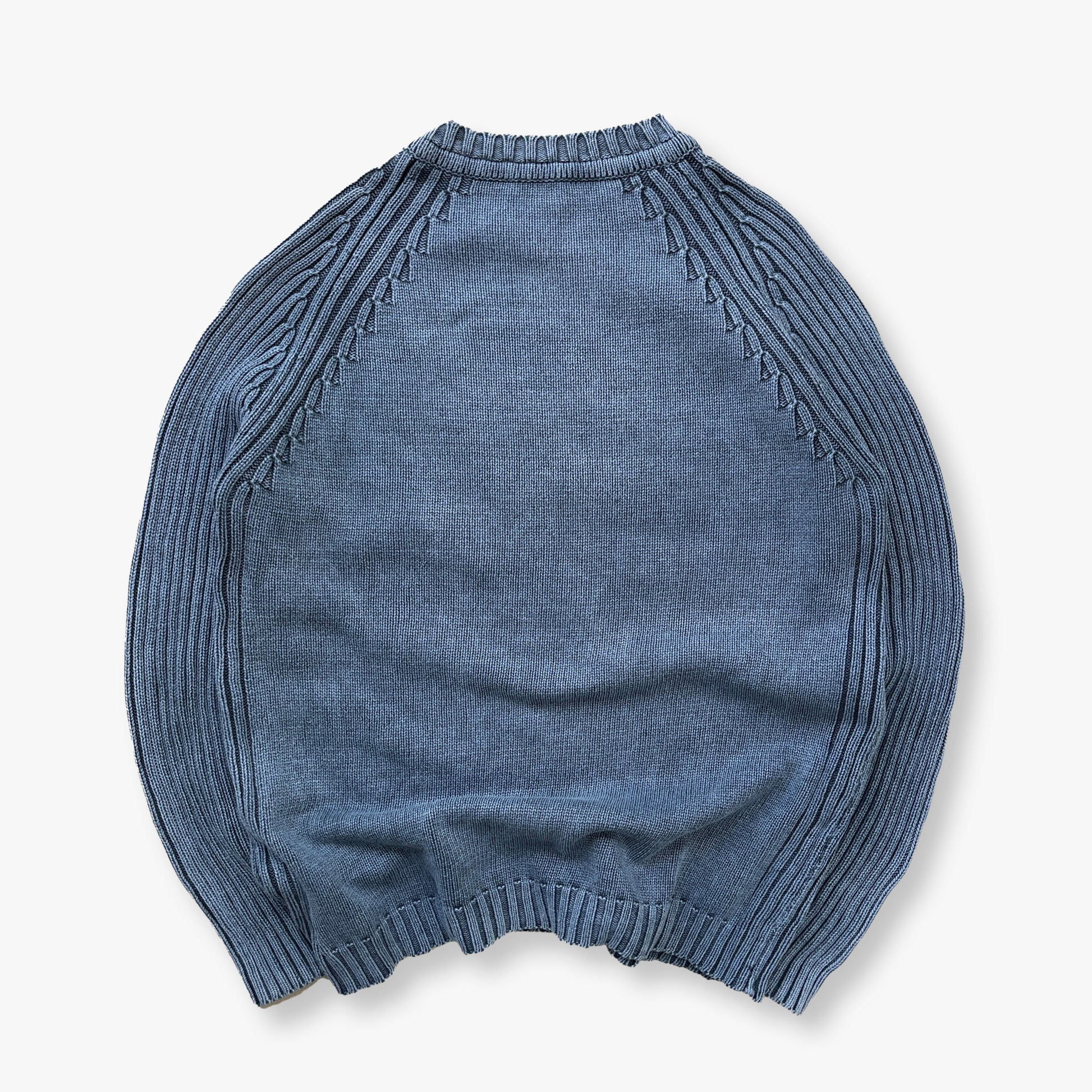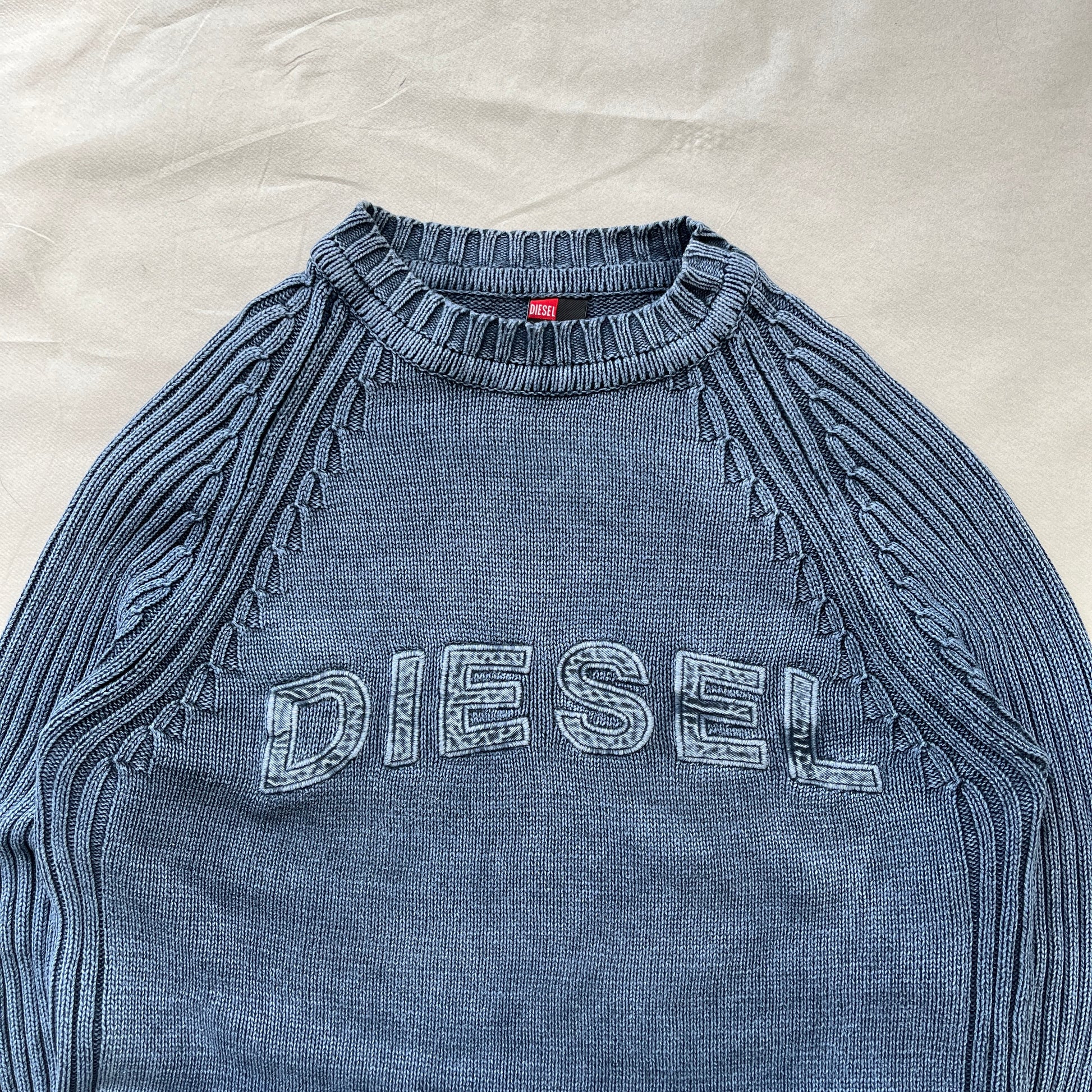 Washed Blue Diesel knit sweater with a spellout logo embroidery on the front. Stroke-knitted sleeves, collar & cuffs.