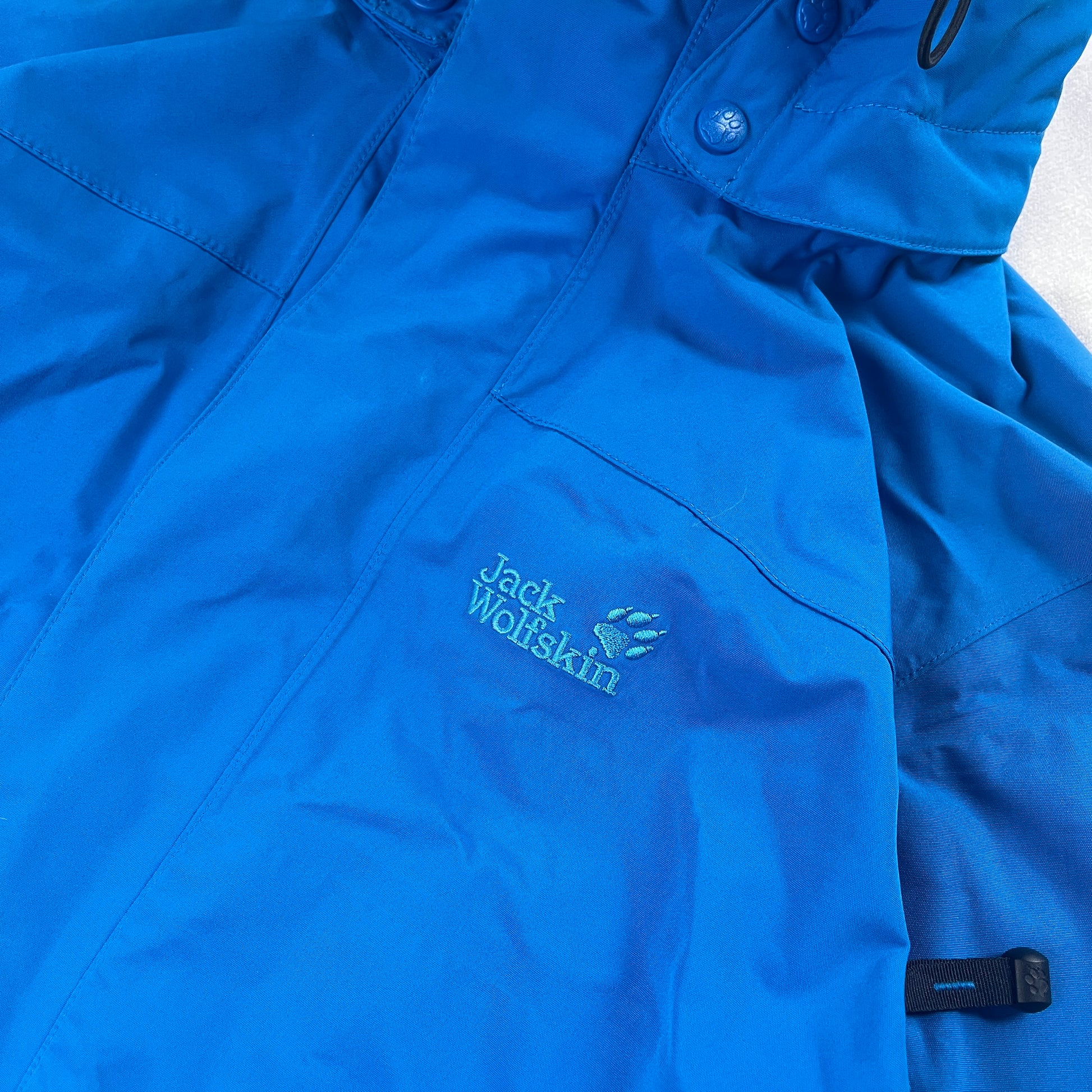 Blue Waterproof Jack Wolfskin Rain Jacket. Hardshell outer with mesh inside.