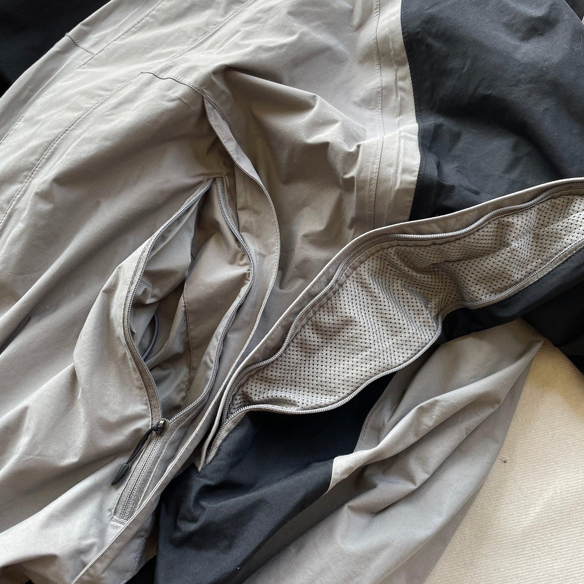 Black/Gray Nike ACG Hardshell OuterLayer3 Waterproof jacket. Great hardshell outer with a soft-touch inner fleece layer & embroidered logo on the sleeve. Features zip-pockets on the front, air-vented armpits, adjustable waist, a two-way zipper, velcro cuffs & snow-skirt.
