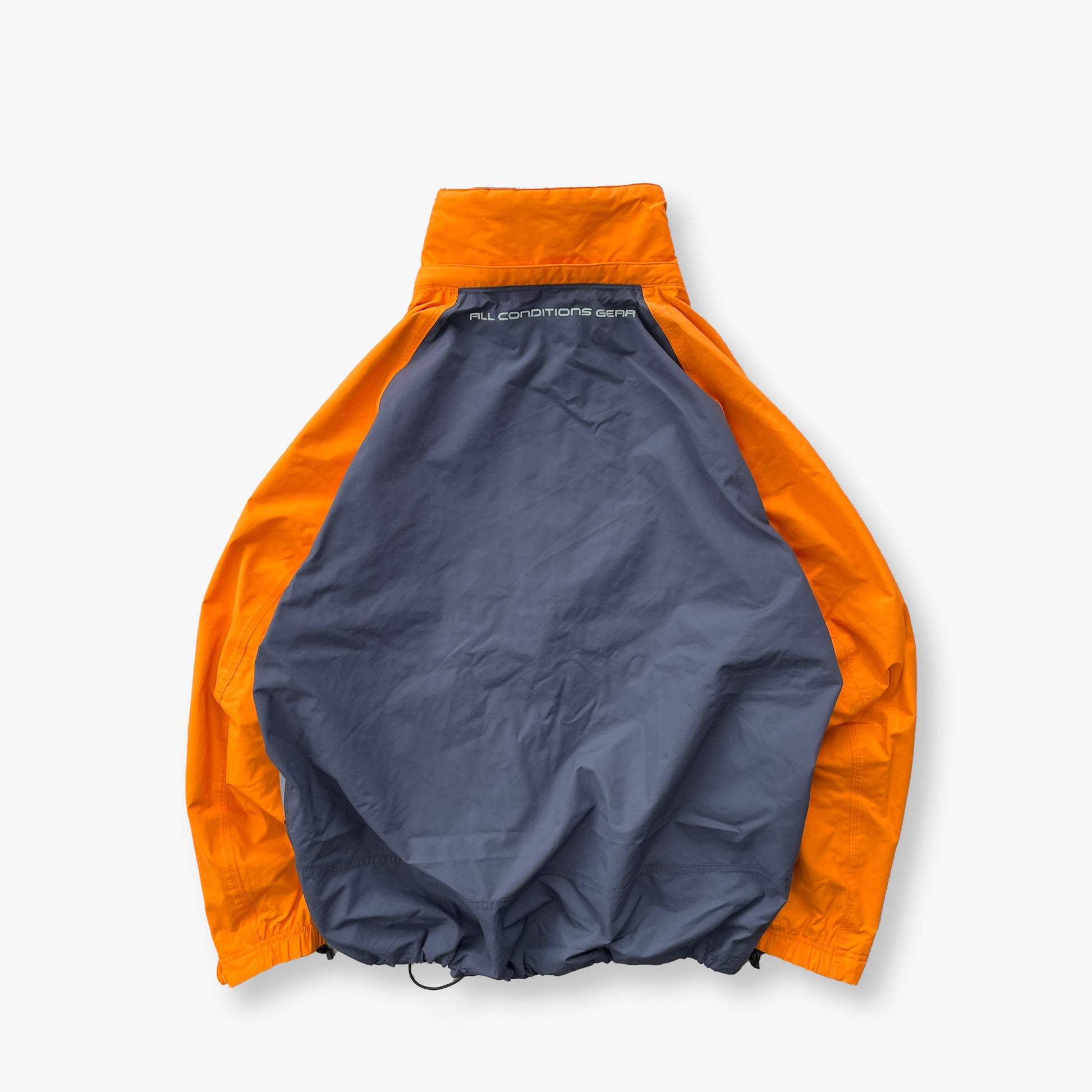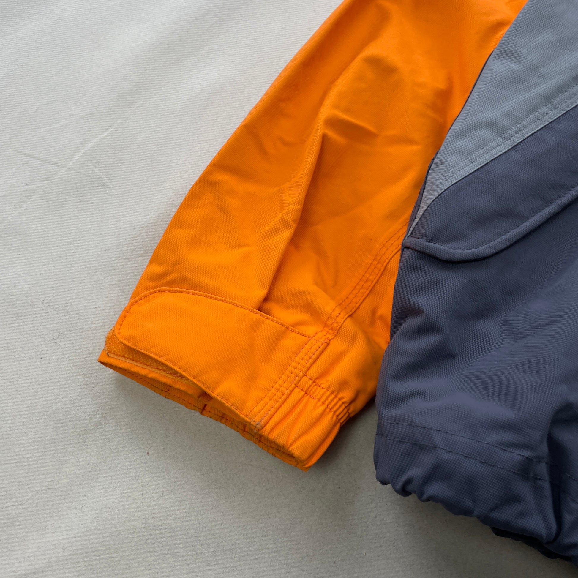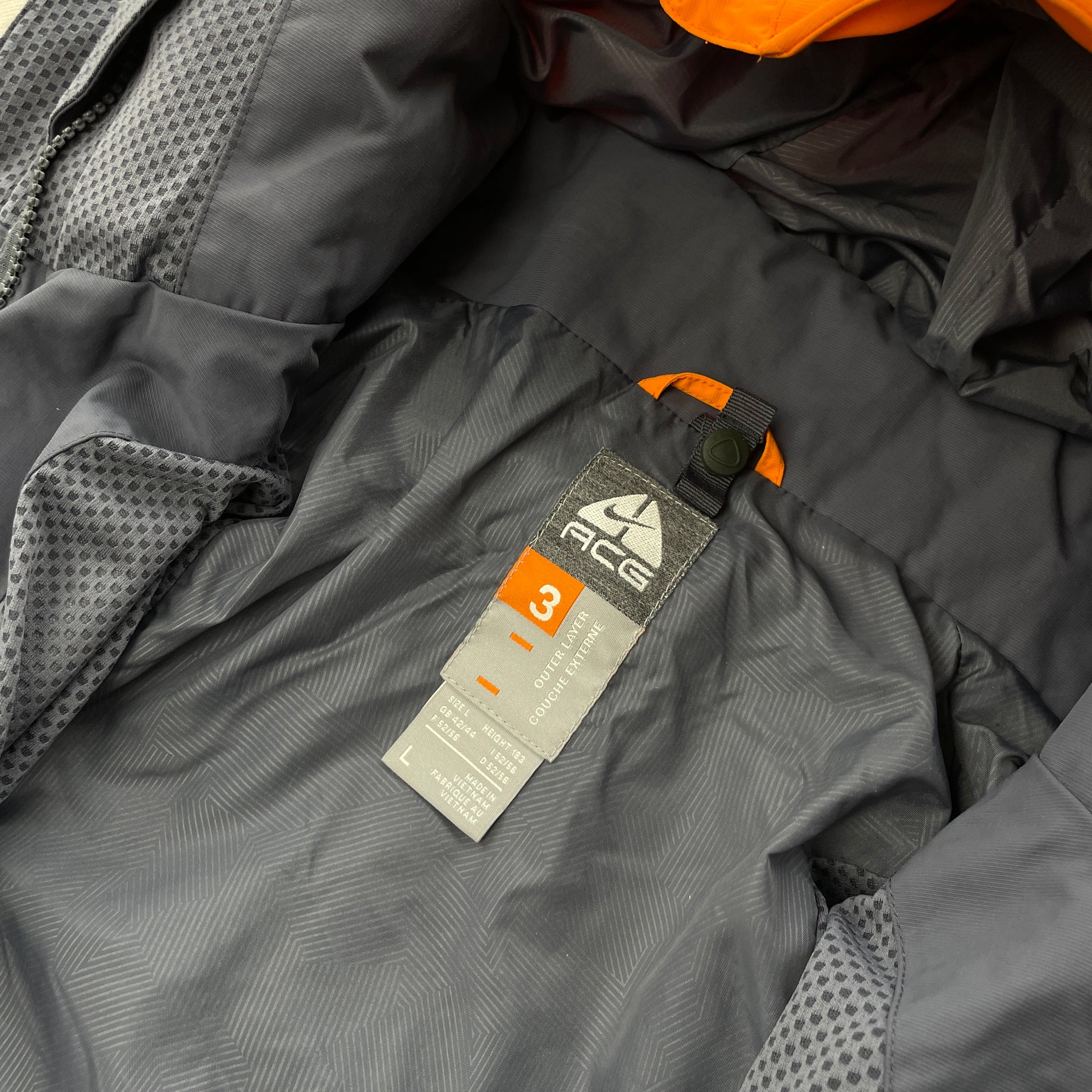 Highly functional Orange/Gray Nike ACG 2in1 Ski Jacket. Great hardshell outer with reflective logos & a soft-touch inner fleece layer. Features a detachable hood with adjustable shockcords (front+back) & multiple zip-pockets on the front. It has a double-closure zip & double full-zip to attach the secondary layer.