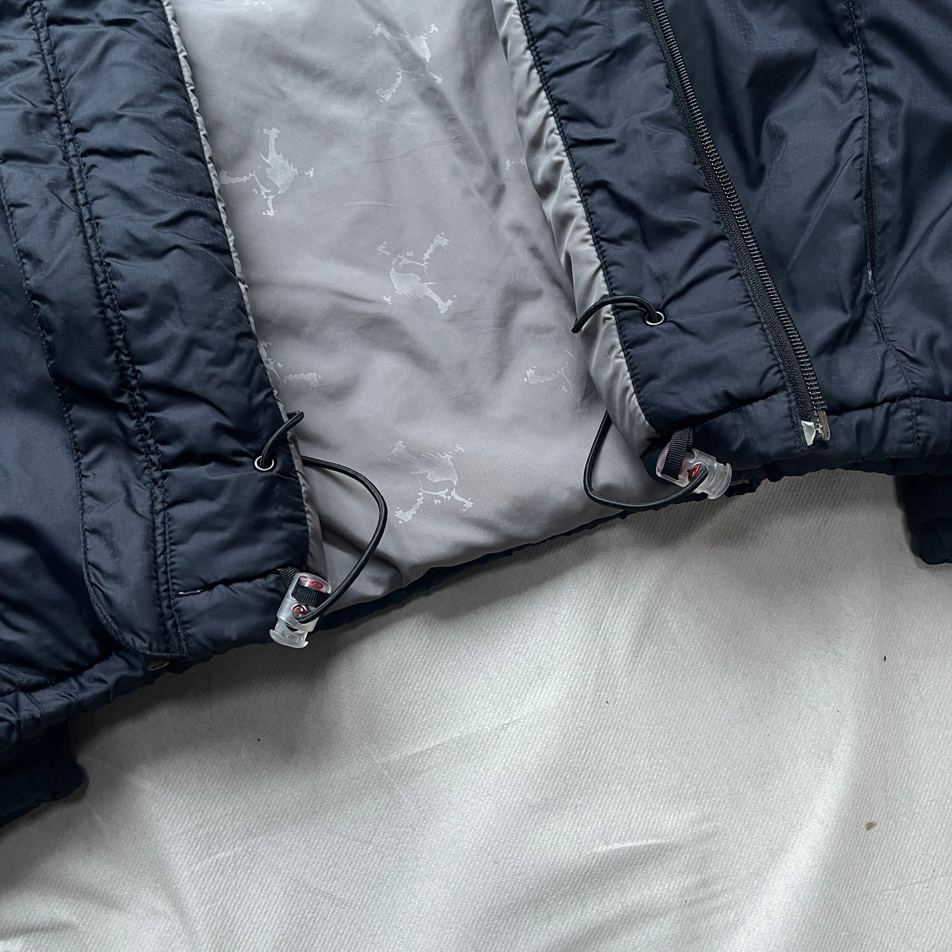 Waterproof outer with light insulation & padding. The zippers fully run from the bottom up around the neckline and back. Starts at the bottom where it opens up 4 normal pockets. At the shoulders it opens up as airvents & around the neck it opens up to unfold the stashable hood.