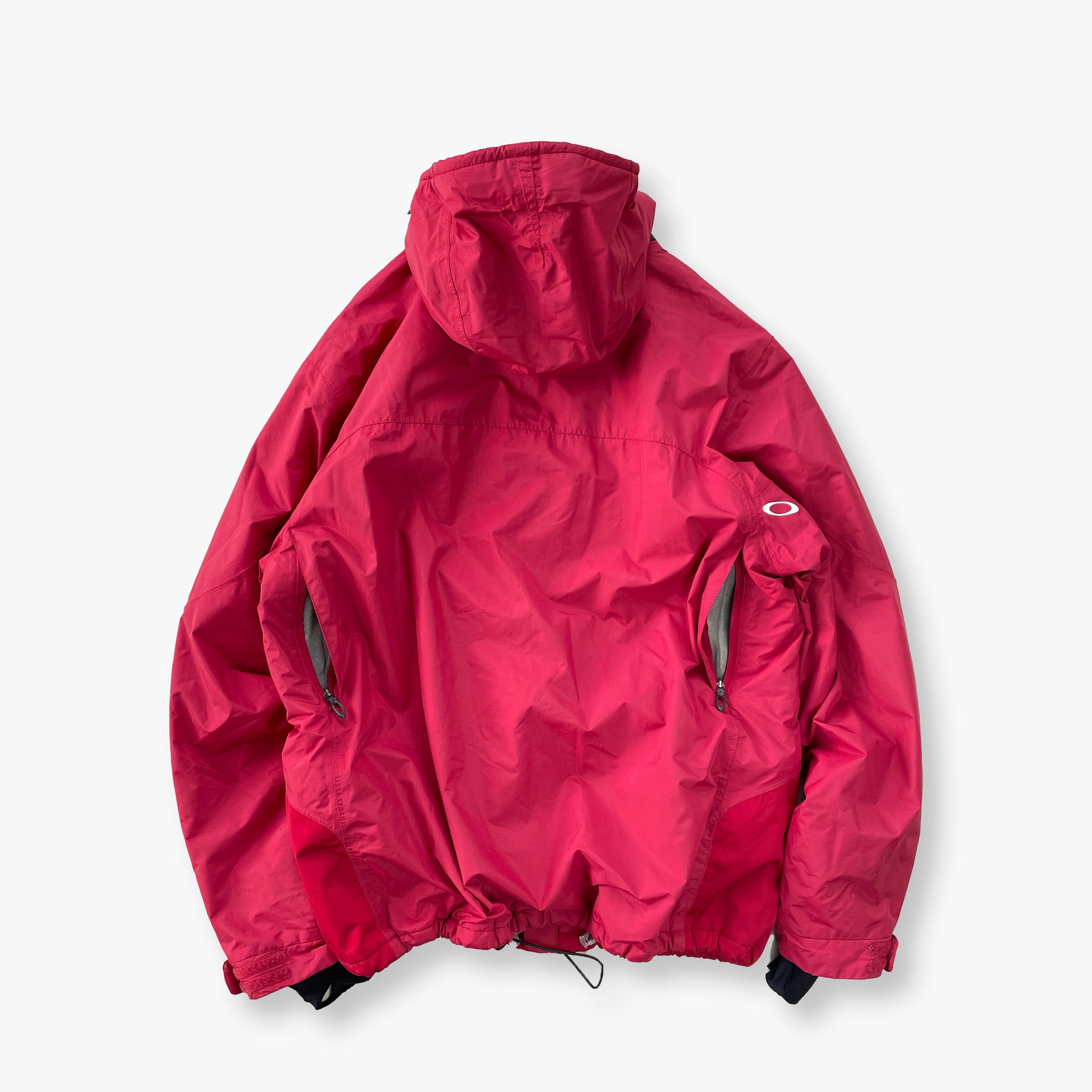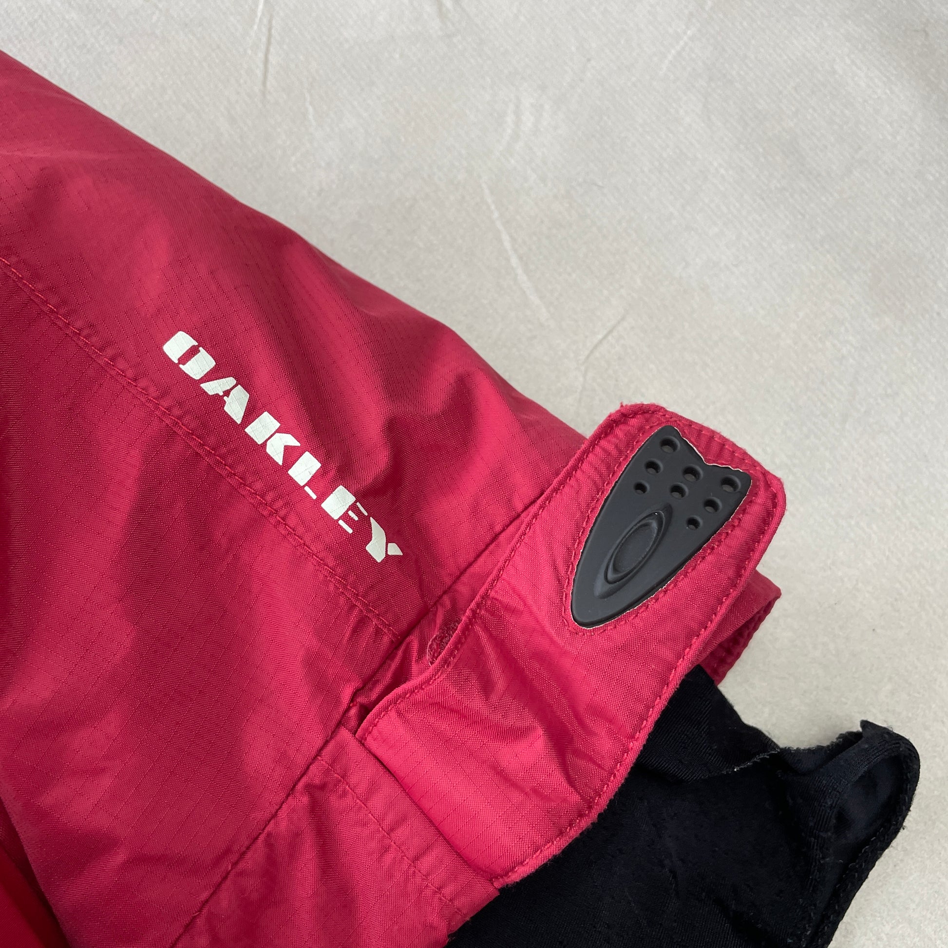 Red 2005 Oakley Technical Vent Jacket. Windproof & insulated outer with 2 airvent-zippers under each armpit. It has an adjustable hood & adjustable shockcord waist & features 2 zip-pockets on the front, 1 chest pocket, 1 inside zip-pocket, a snow-stopper & velcro sleeve cuffs.