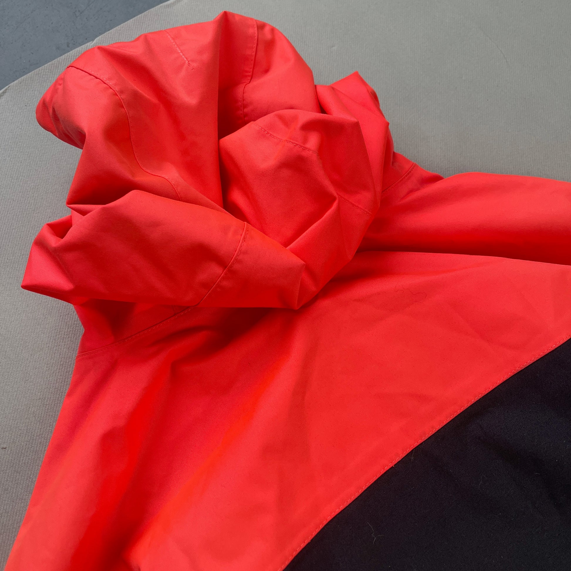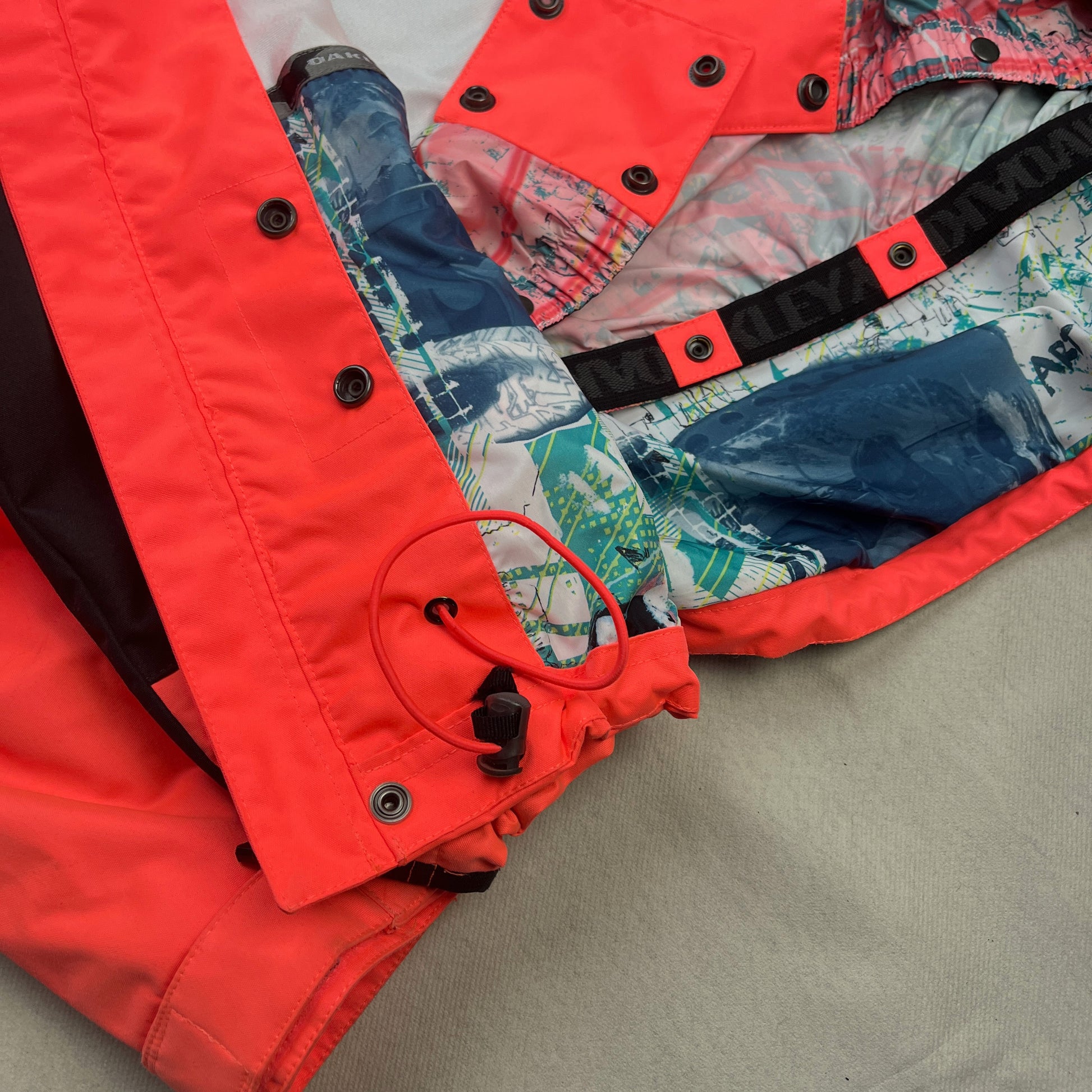Salmon (Pink-tinted Neon Orange) & Black 2010 Oakley Technical Ski Jacket. Snow -& windproof outer with airvent-zippers and a highly durable construction. It has a hood with magnetic attachment & adjustable shockcords. It's adjustable at the waist & features 2 zip-pockets on the front, inside zip-pocket, a snow-stopper & velcro sleeve cuffs.