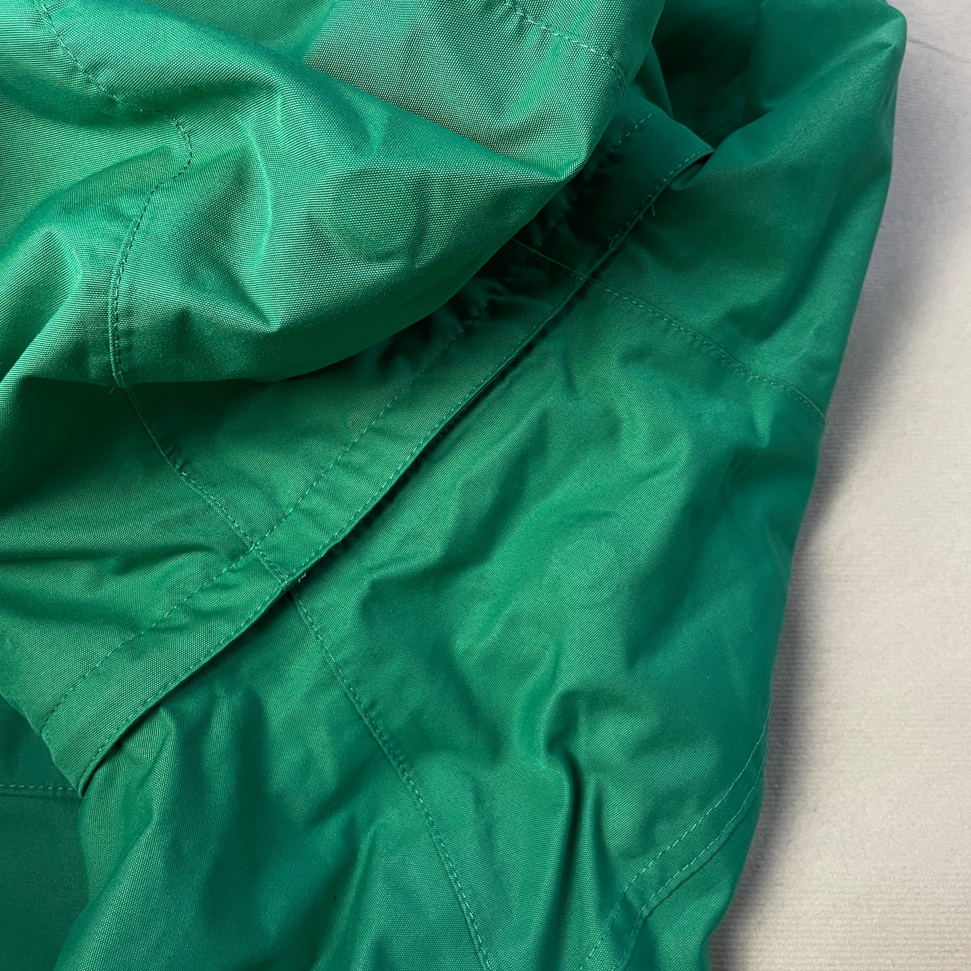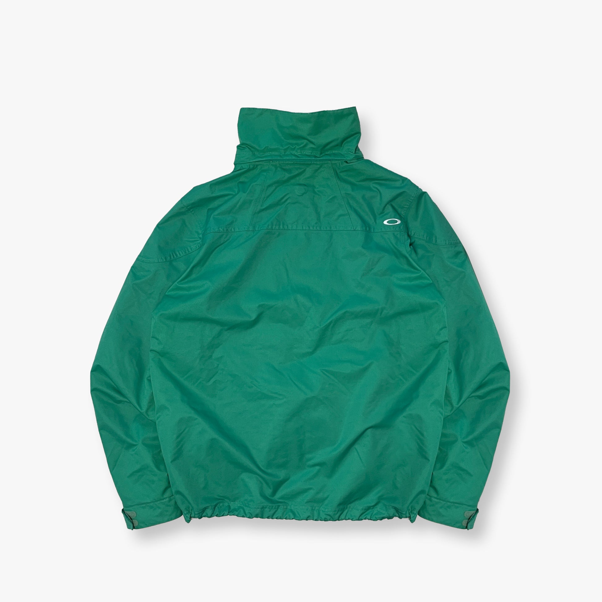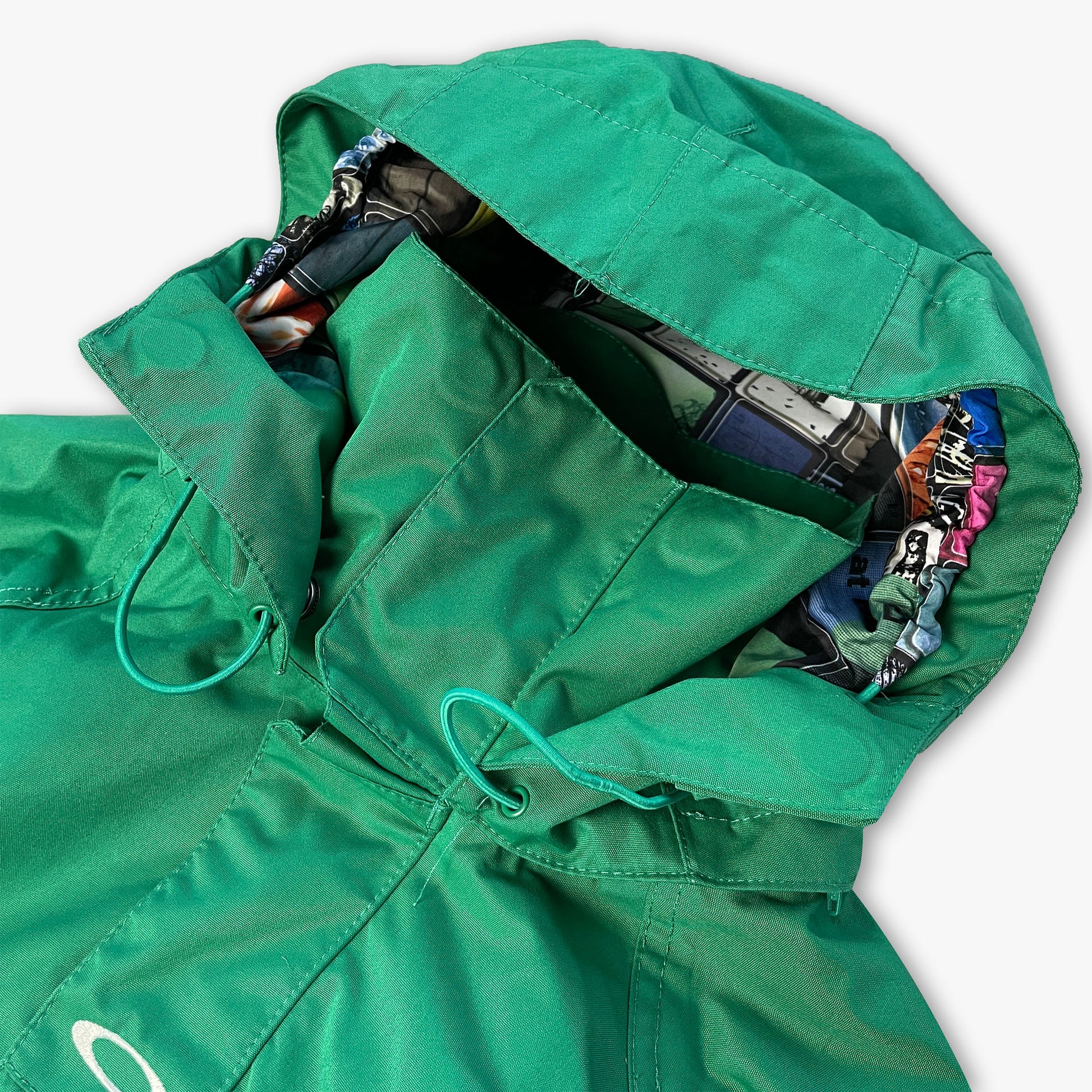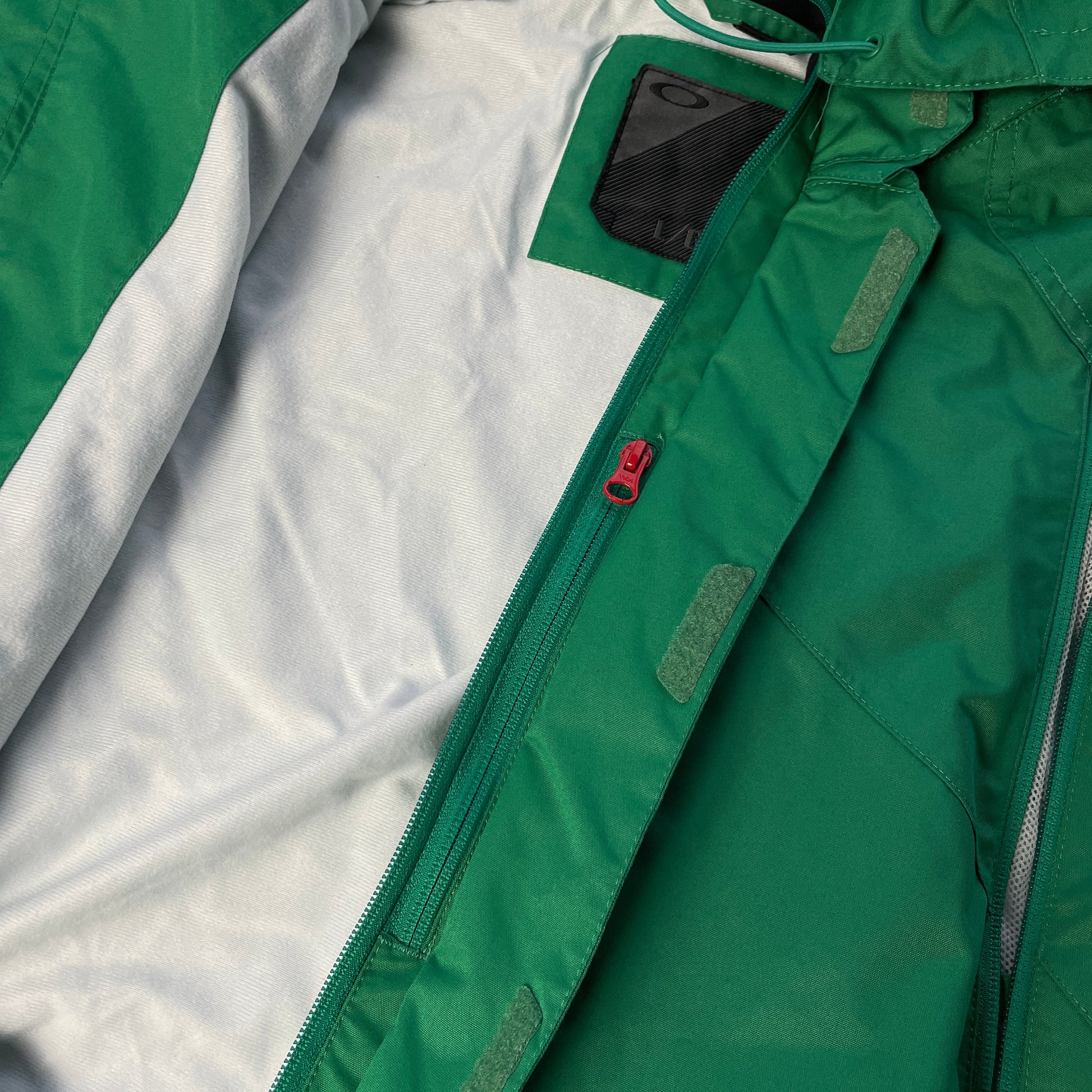 Kelly green 2011 Oakley Technical Ski Jacket. Windproof outer with airvent-zippers and a highly durable construction. It has a functional detachable hood with magnetic attachments & adjustable shockcords. It's adjustable at the waist & features 2 zip-pockets on the front, inside zip-pocket, a snow-stopper & velcro sleeve cuffs.