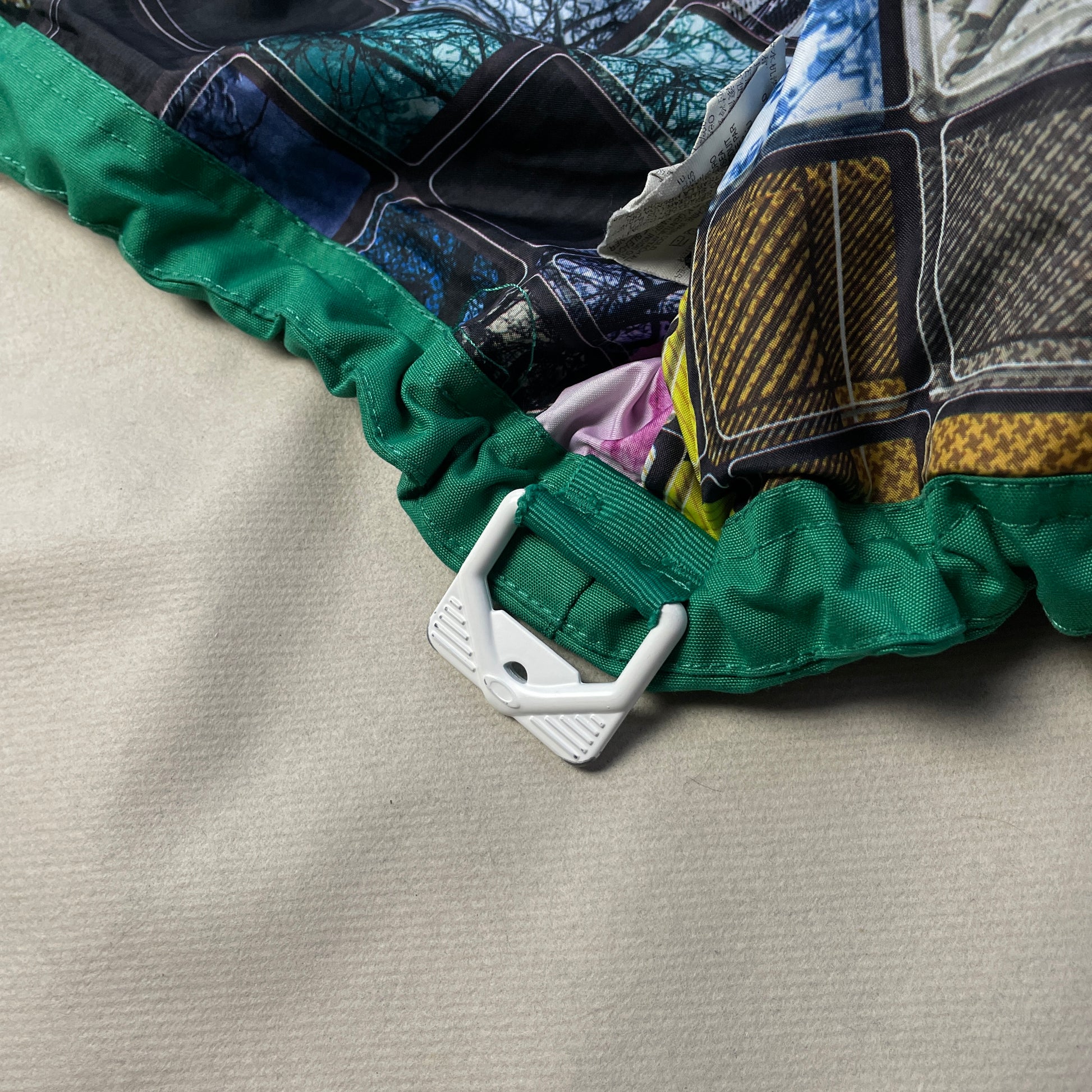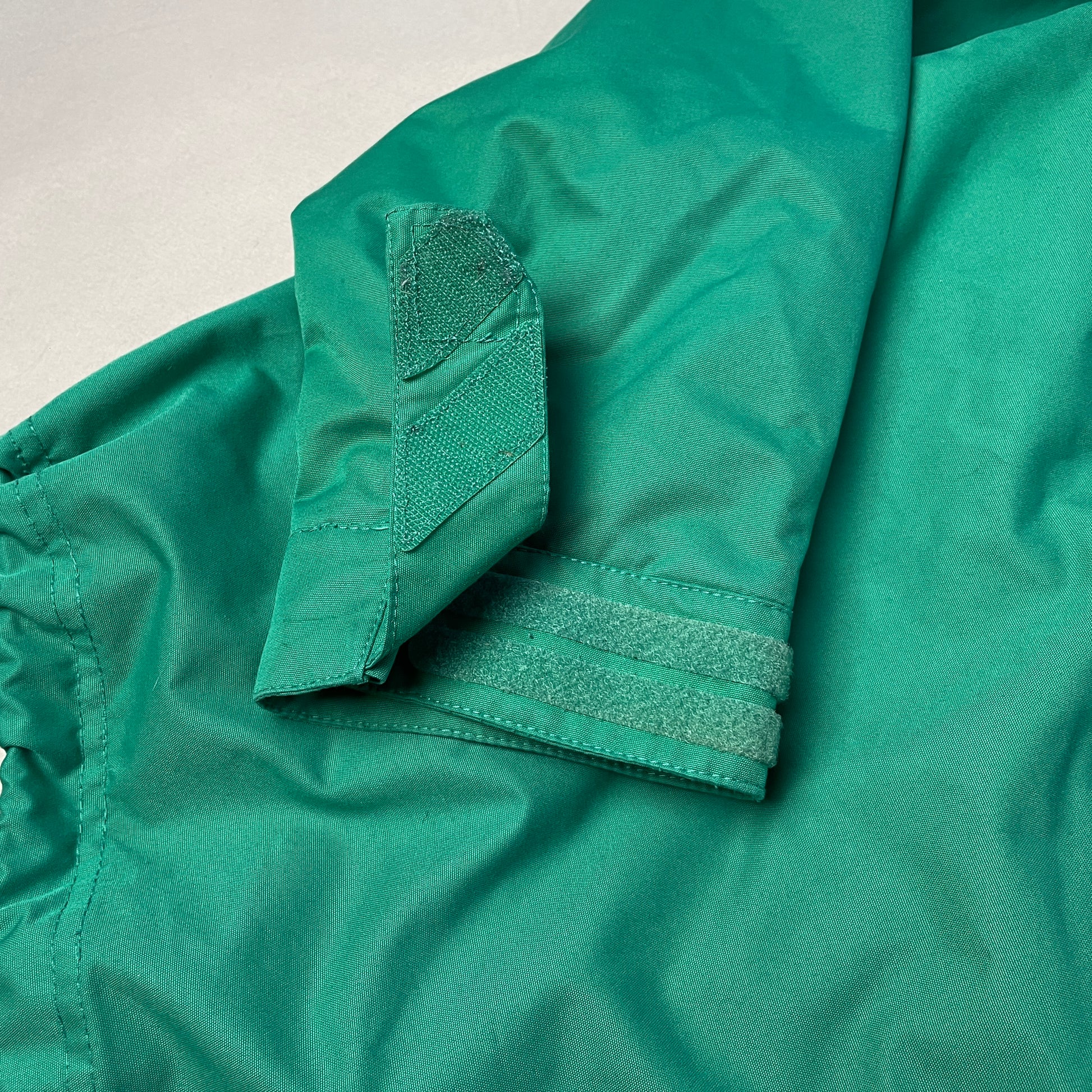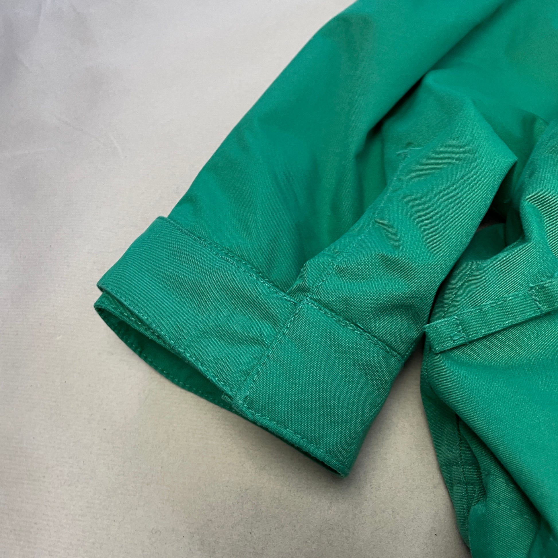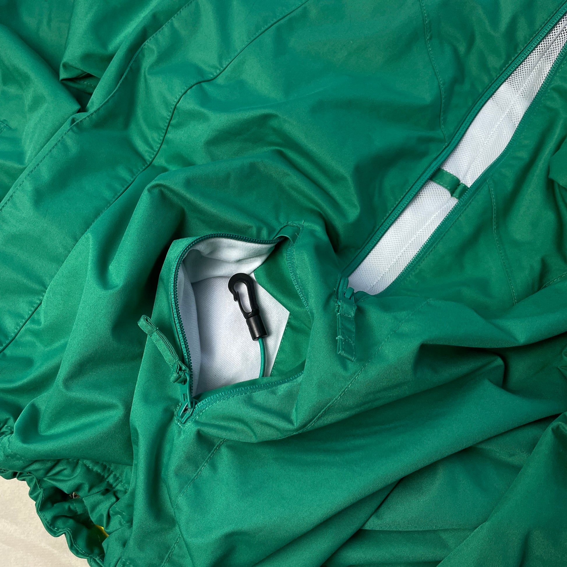 Kelly green 2011 Oakley Technical Ski Jacket. Windproof outer with airvent-zippers and a highly durable construction. It has a functional detachable hood with magnetic attachments & adjustable shockcords. It's adjustable at the waist & features 2 zip-pockets on the front, inside zip-pocket, a snow-stopper & velcro sleeve cuffs.