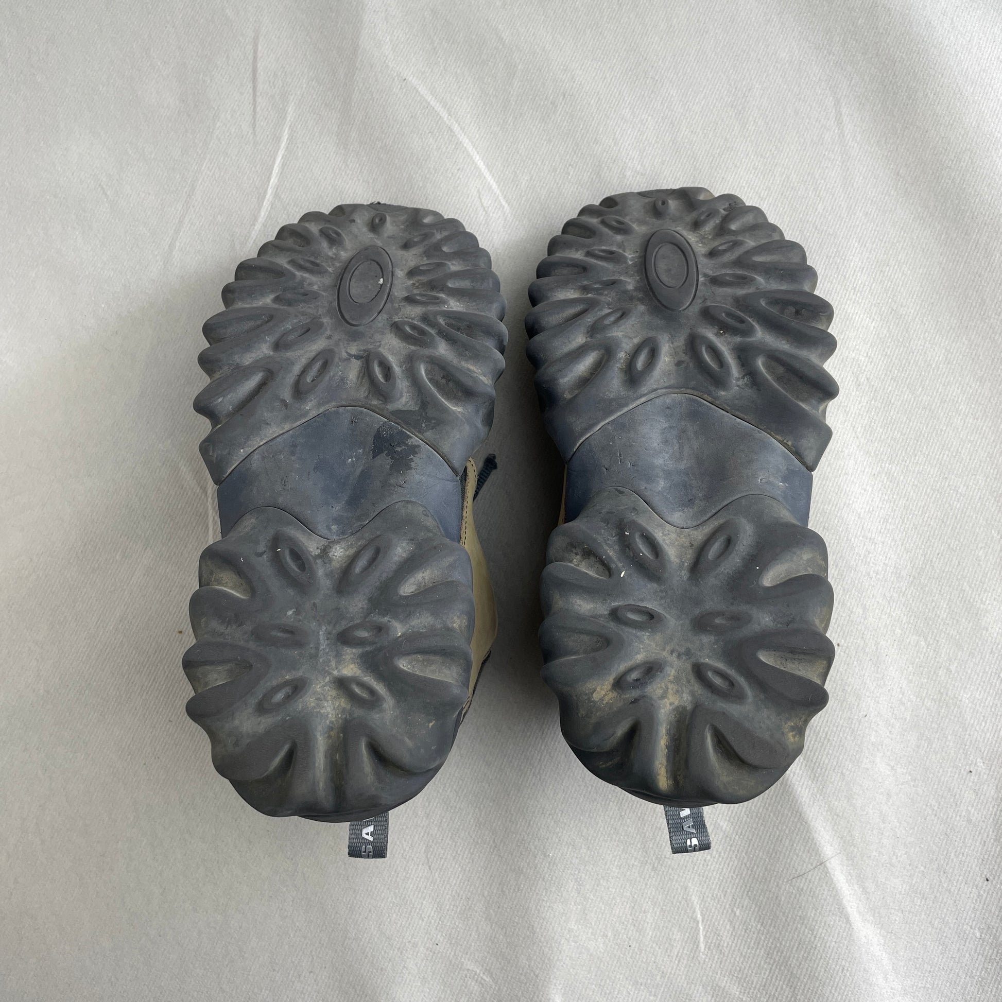 Tan/Gray OakleyNubuck Chop Saw 2023 shoes with black sole. Features the unique bottom design, a metal logo on the sides & leather upper.