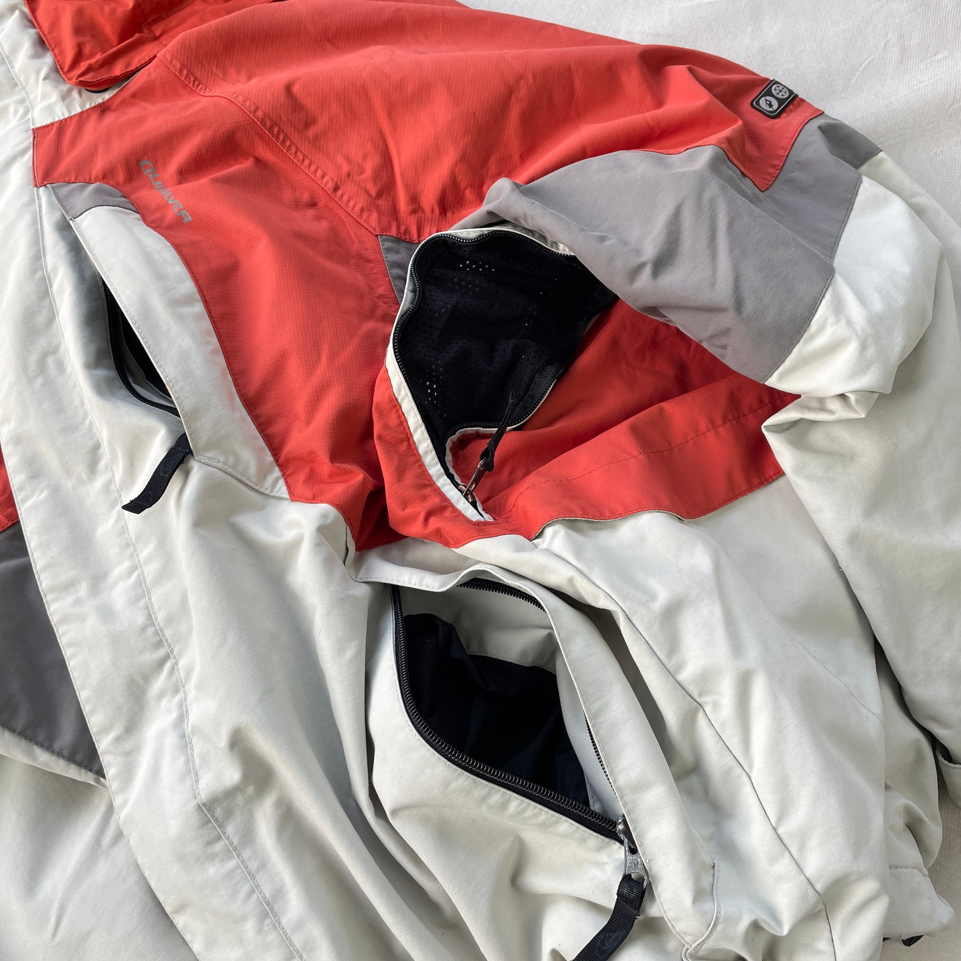Rust Orange(Red)/White 2000s Quiksilver ABT X-Series Ski Jacket. Nicely panelled ripstop weatherproof outer with a fleece lining & airvent-zippers under the armpits. Features a detachable hood that can be adjusted with shockcords at the sides+back. A lot of functionality: 2 zip-pockets, 2 chest zip-pockets, inside pocket, adjustable waist, velcro sleeve cuffs & a snow-skirt.