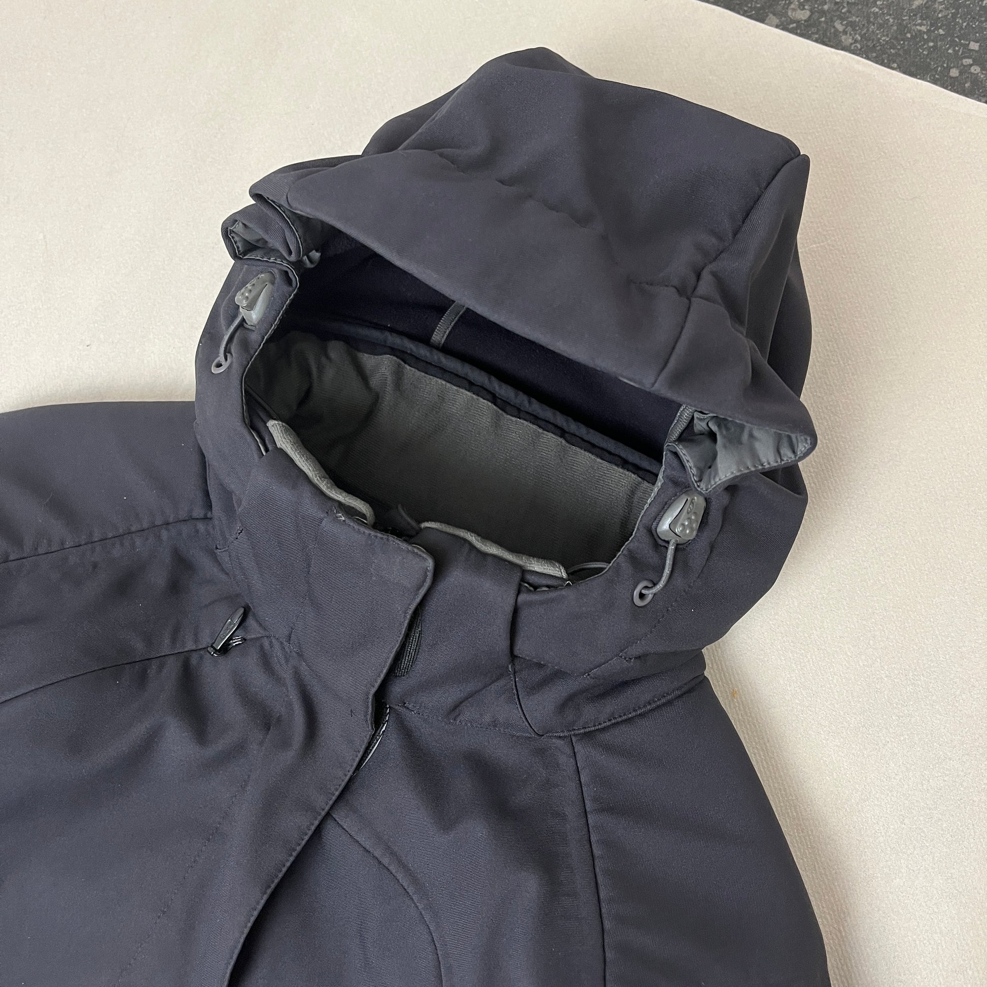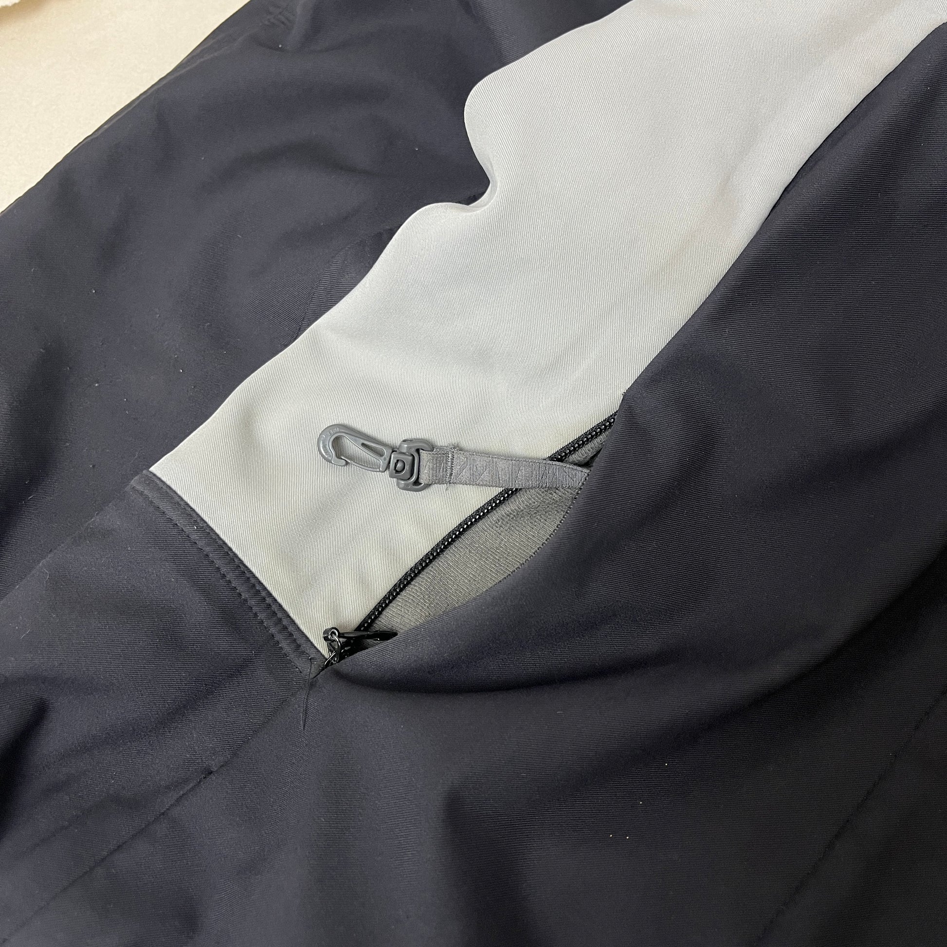Features functional front pockets with elastic keychain carabiner + retractable keychain hook system, inside pockets, detachable hood with adjustable shockcords (front + back), adjustable shockcords at the waist & a snow-stopper as well. It has a two-way zip & double zipper to attach a secondary inner layer.