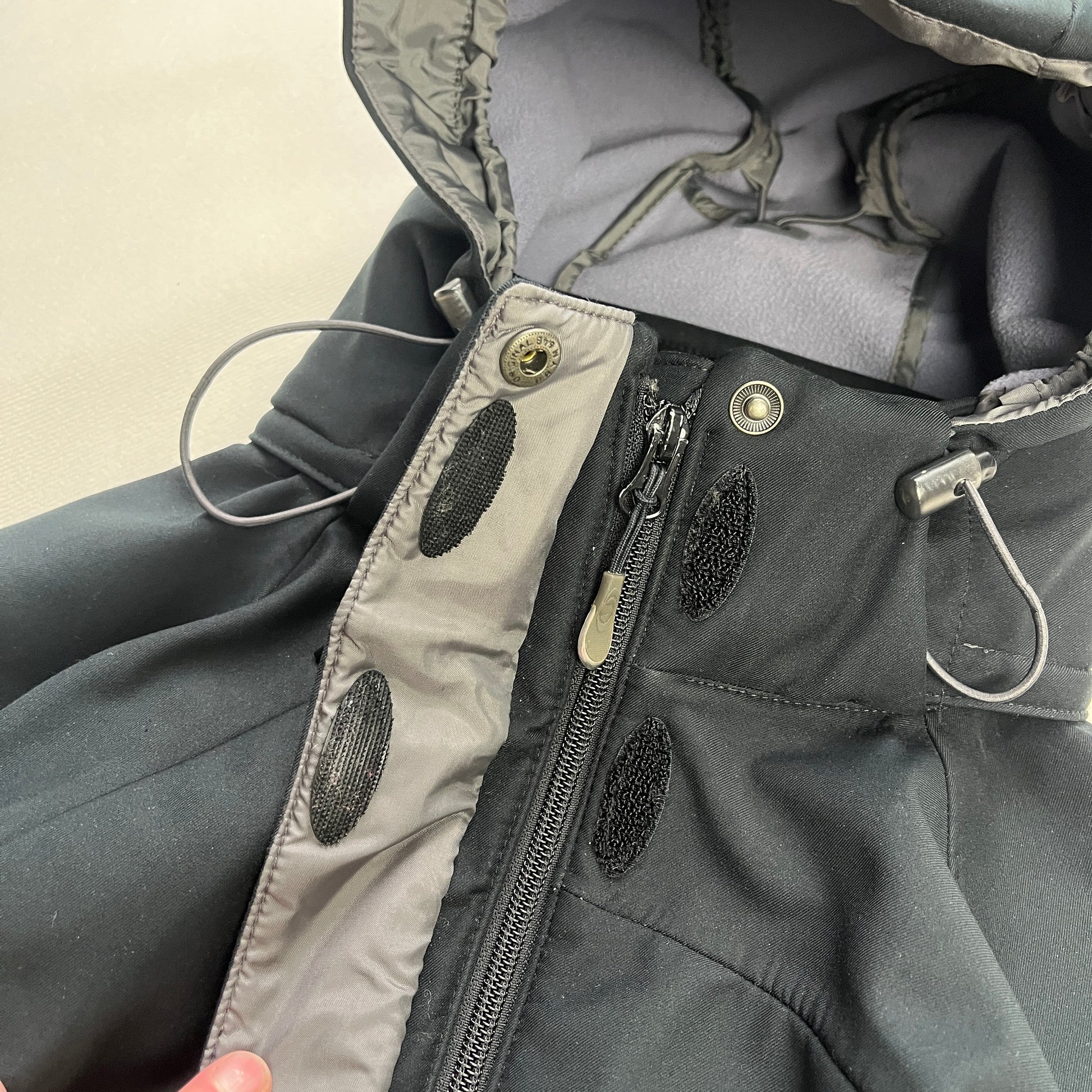 Features front zip-pockets with elastic keychain carabiner, a hidden chest pocket with goggle-cleaning foam, inside pocket, detachable hood with adjustable shockcords, adjustable shockcords at the waist, a snow-stopper & velcro sleeve cuffs. It has a two-way zipper + an extra zipper to attach the inside jacket.