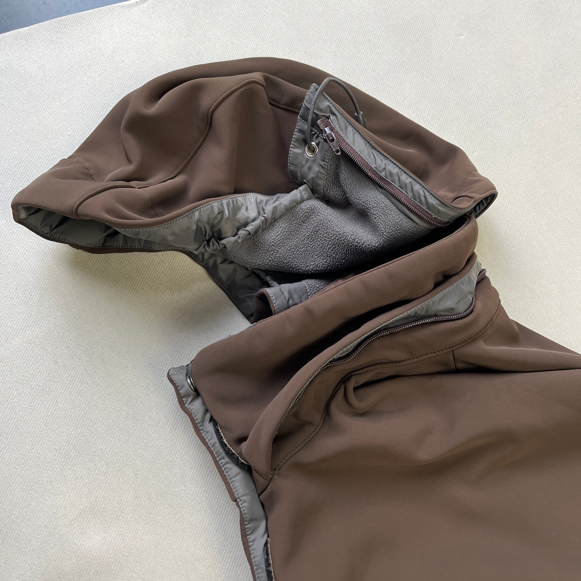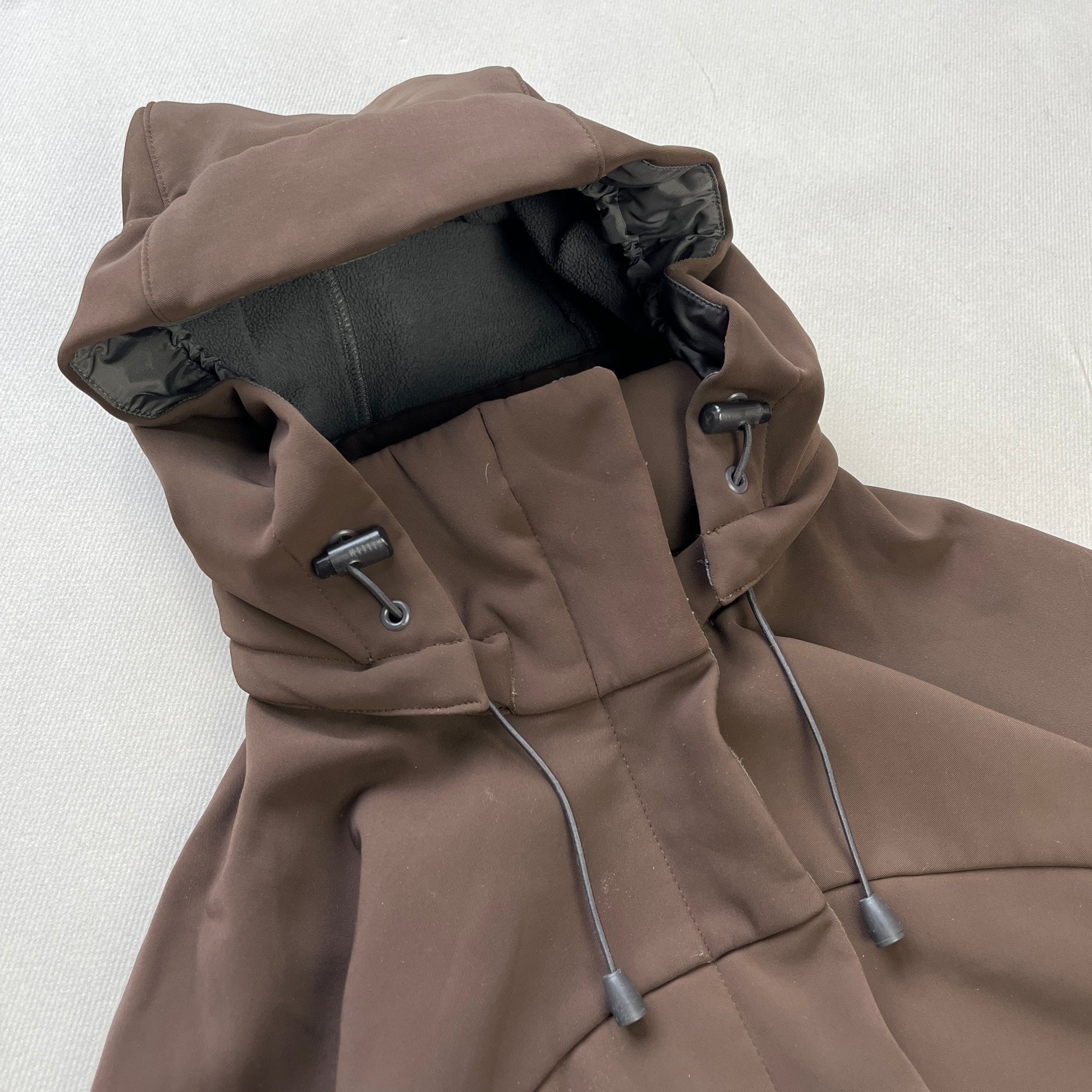 Features functional front pockets with elastic keychain hook, a sleeve pocket with goggle-cleaning cloth, inside pockets, detachable hood with adjustable shockcords (sides+back), adjustable shockcords at the waist & a snow-stopper as well. It has a double closure zip & double zipper to attach a secondary inner layer.