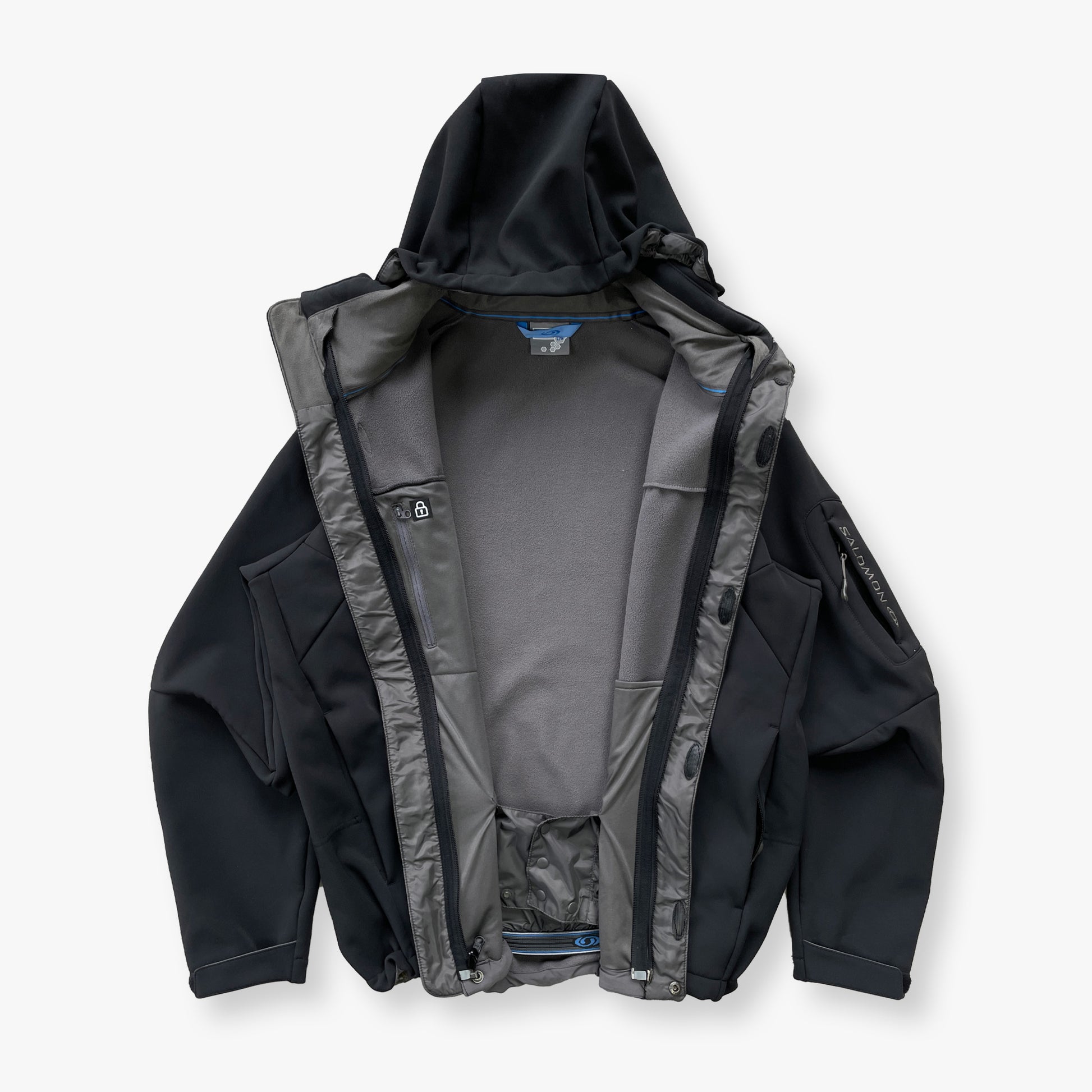 Beautifully paneled 2in1 Salomon 2009 Ski Jacket with the best feeling outer fabric I have come across so far. Softshell ClimaPro making it water-repellent (*not waterproof) & the fleece lining completes it by making it very warm.