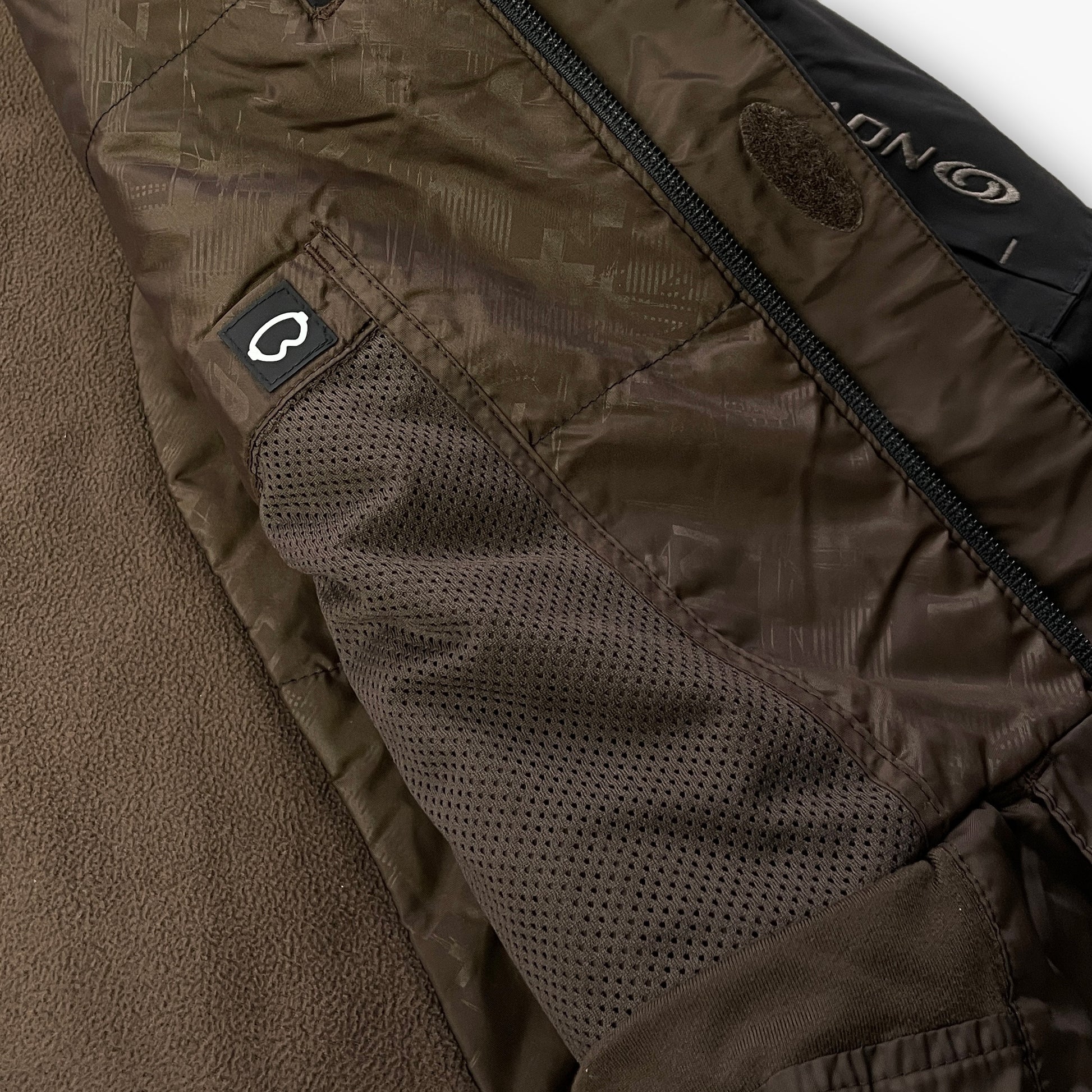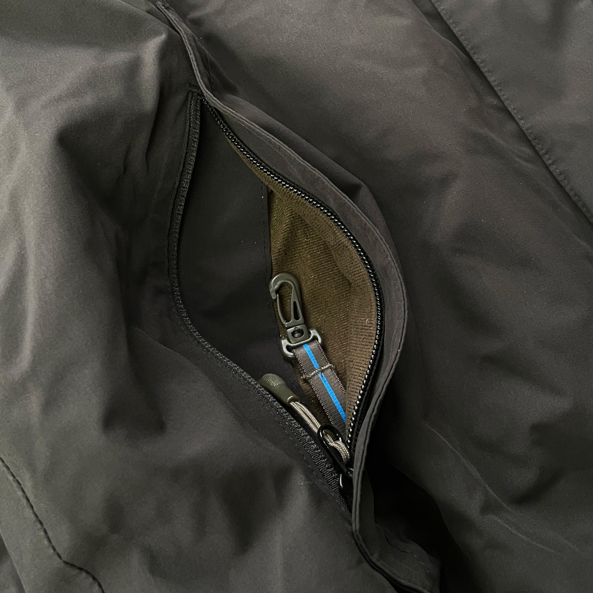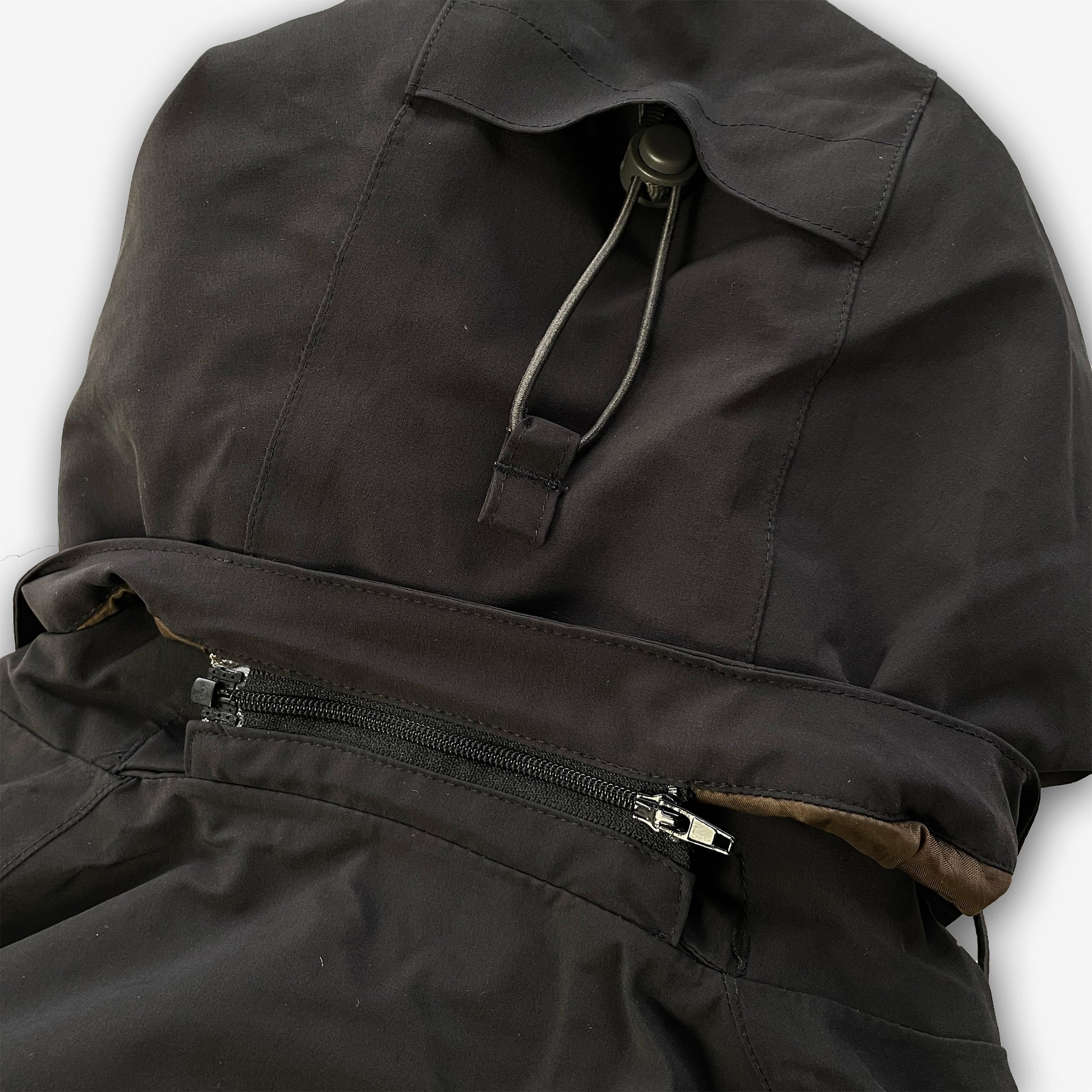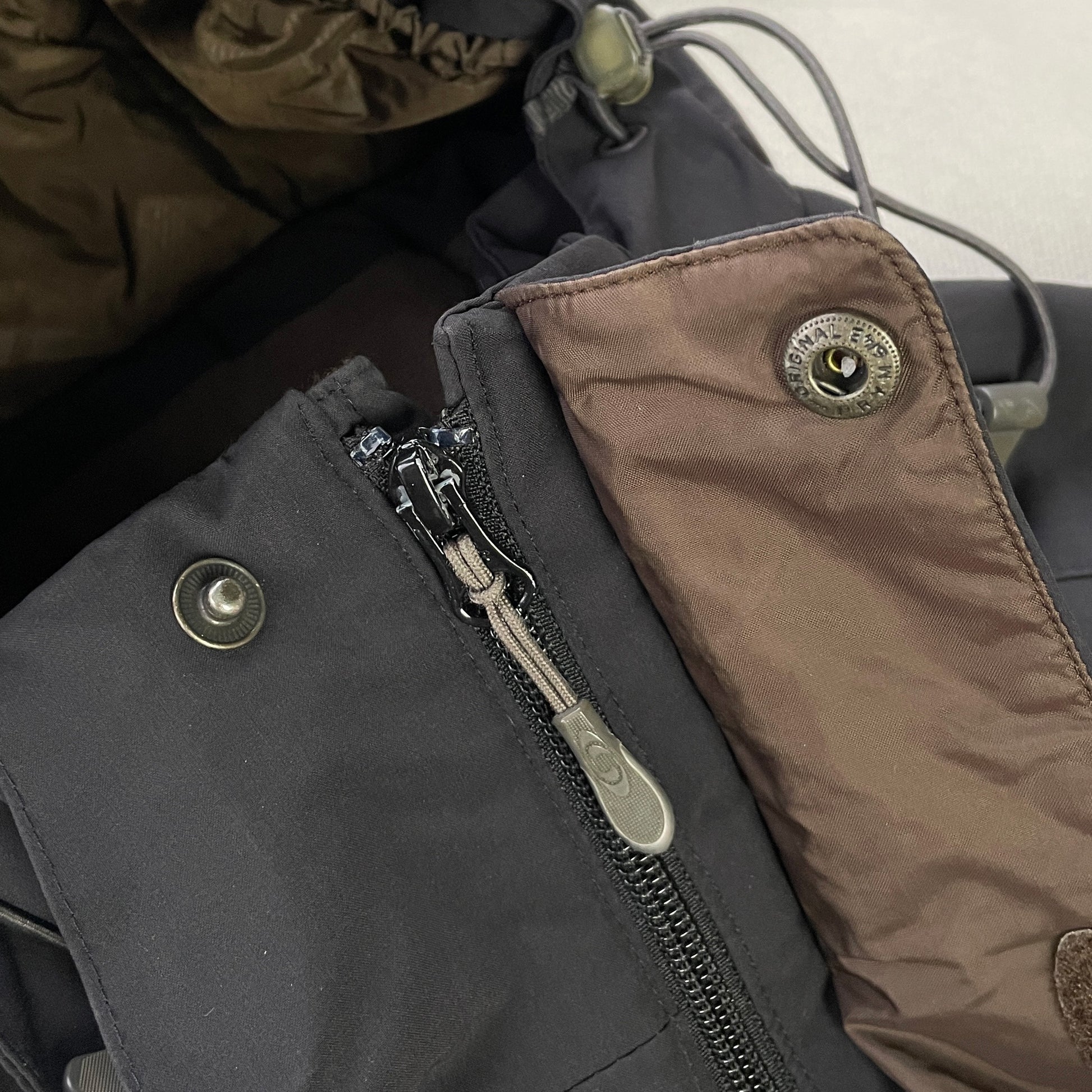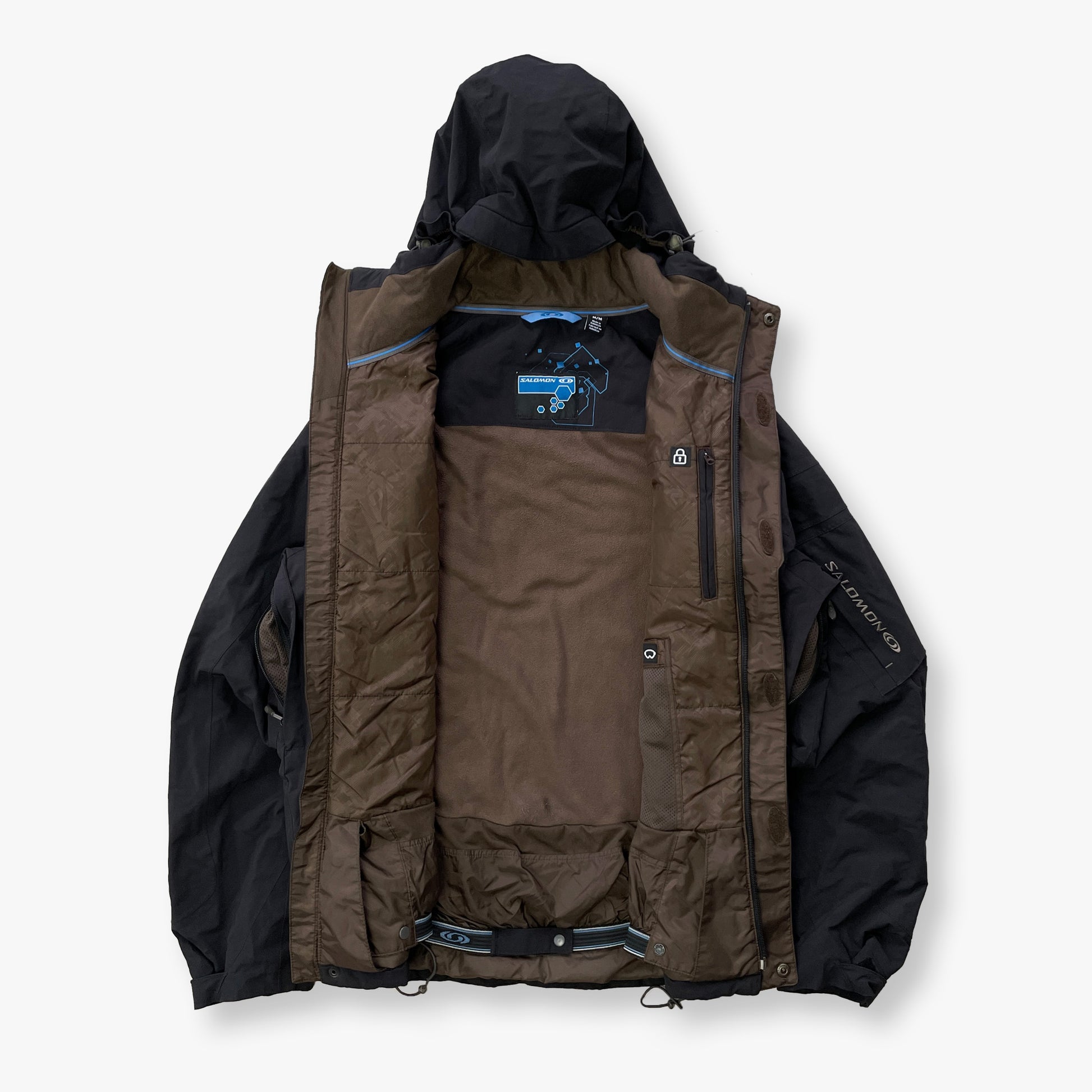 Features front zip-pockets, 2 chest pockets (1 with goggle-cleaning cloth), an arm-pocket, inside zip-pocket + goggle-pocket & a detachable hood with adjustable shockcords (sides + back). Also has the typical double-closure zip, adjustable shockcords at the waist, velcro sleeve cuffs & a snow-stopper.