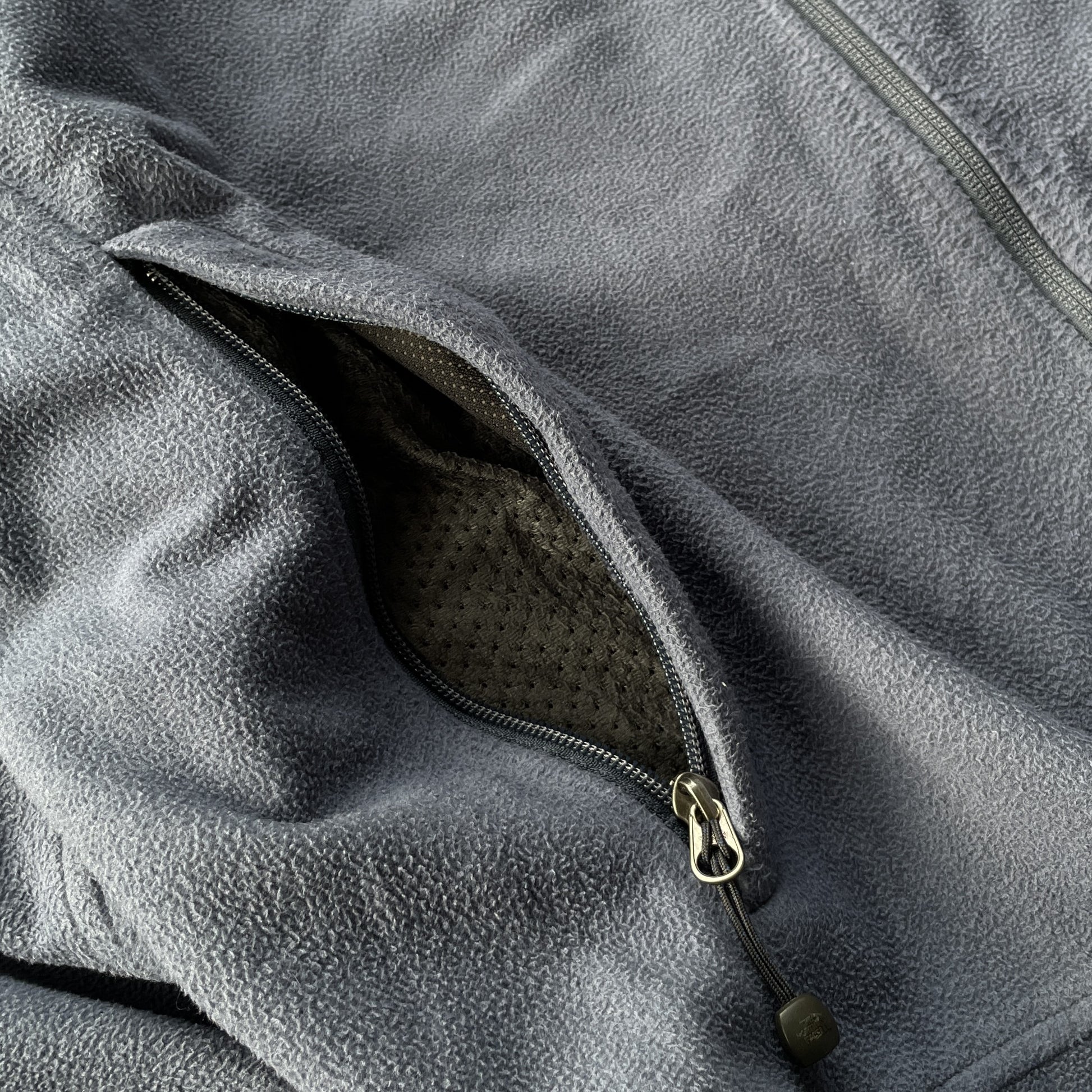 Grey-ish Navy Blue Windwall paneled fleece. Great classic piece with a perfect fit. Adjustable shockcord waist, 2 front zip-pockets & elastic sleeve cuffs. Embroidered logo on chest & back.