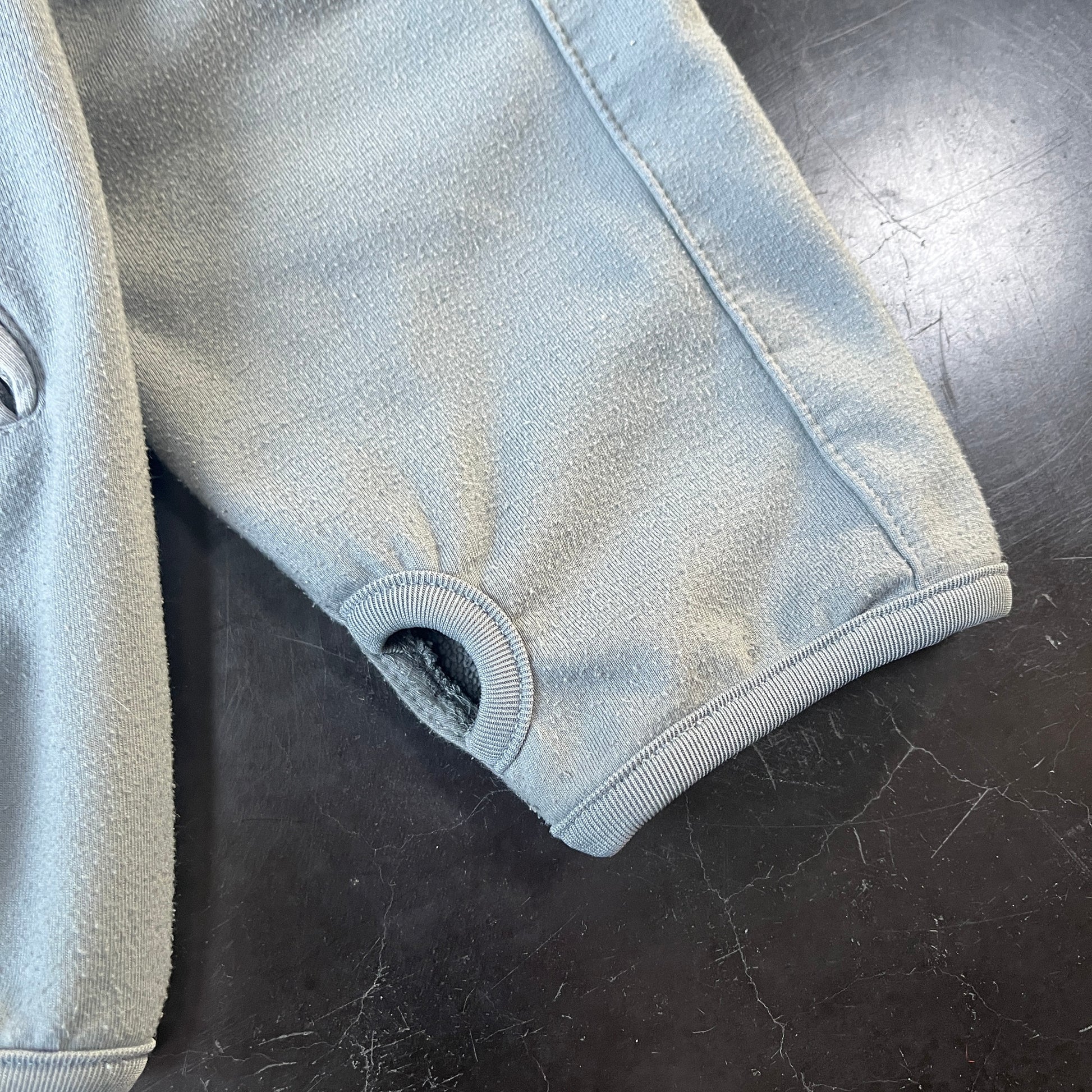 White Umbro Sports Zip Pullover. Grey cotton fabric with white mesh panels & mesh hood. Fleece feel on the inside. 2 zip-pockets on the front & the sleeves have thumb holes for extra warmth/comfort.